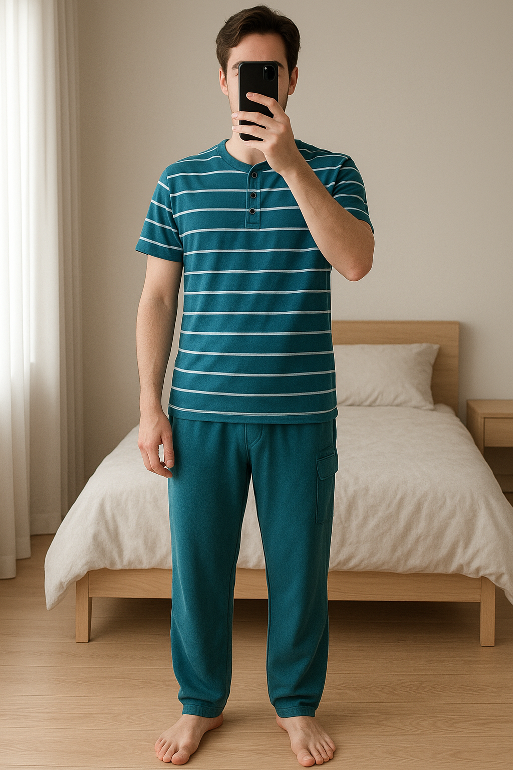 Pigiama uomo in piedi, rivolto verso la fotocamera, in una camera da letto con luce soffusa e luce naturale che filtra dalla finestra.