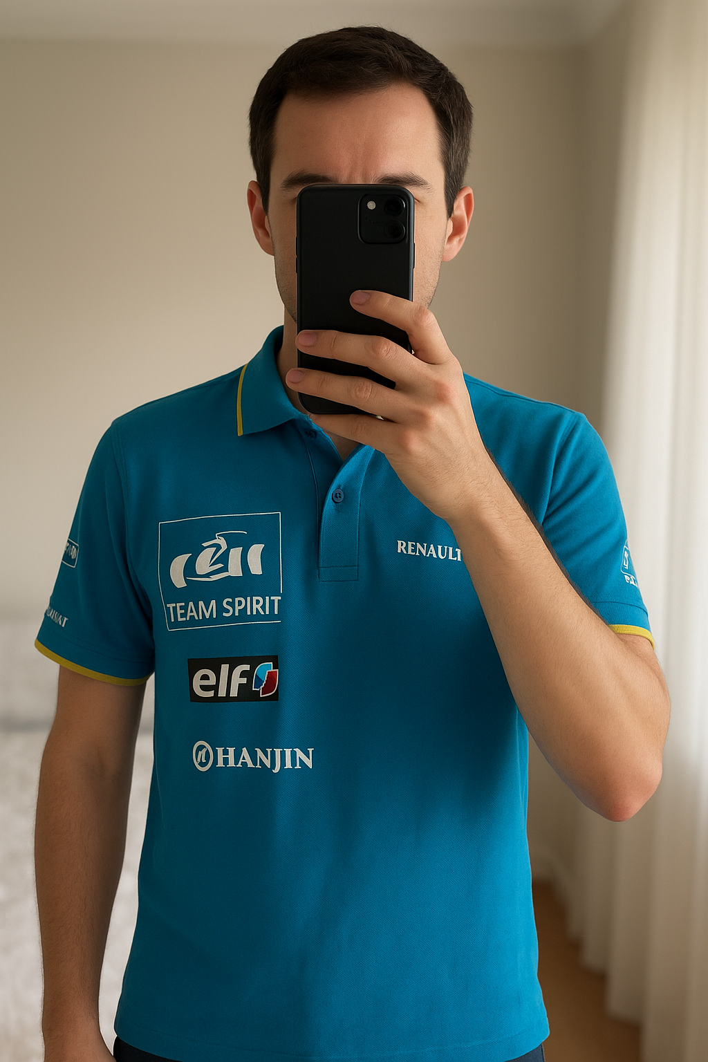 Polo F1 Renault debout, face à la caméra, dans une chambre à la lumière douce, avec une lumière naturelle filtrant par la fenêtre.