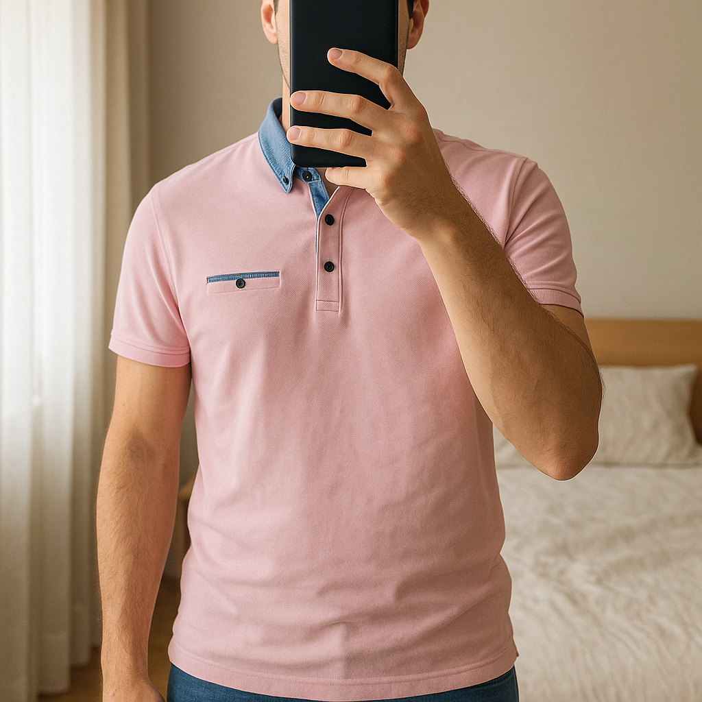 Polo Homme Zara Taille XXL debout, face à la caméra, dans une chambre à la lumière douce, avec une lumière naturelle filtrant par la fenêtre.