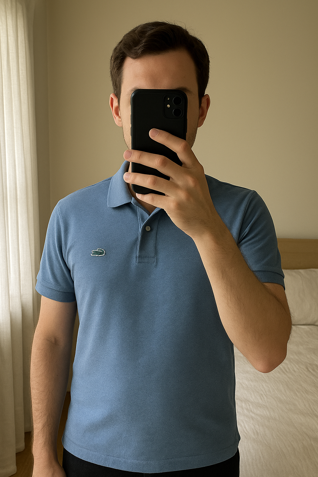 Polo Lacoste Classic Fit bleu – très bon état debout, face à la caméra, dans une chambre à la lumière douce, avec une lumière naturelle filtrant par la fenêtre.