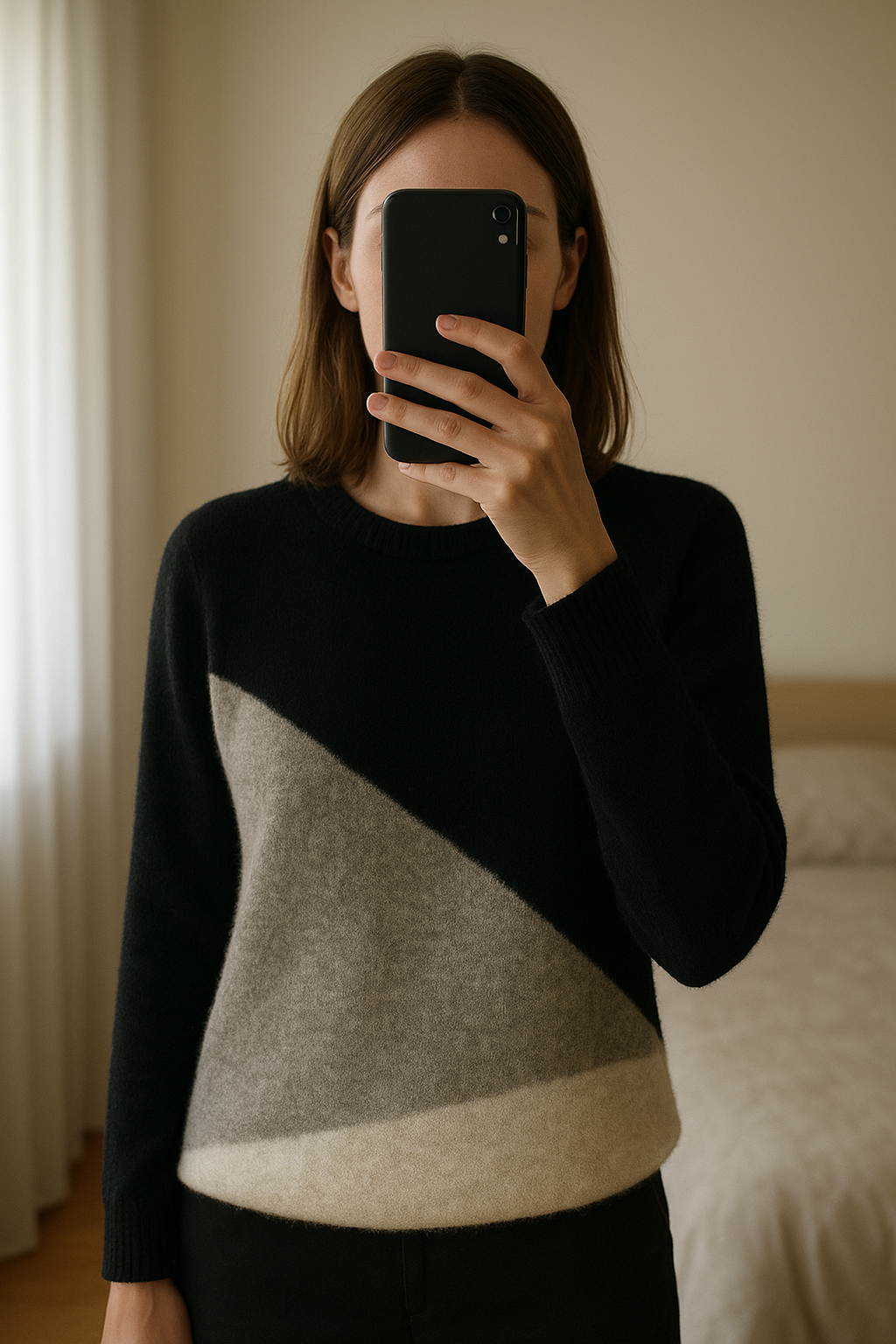 Pull 100% cachemire Maison 123 taille 36-s debout, face à la caméra, dans une chambre à la lumière douce, avec une lumière naturelle filtrant par la fenêtre.