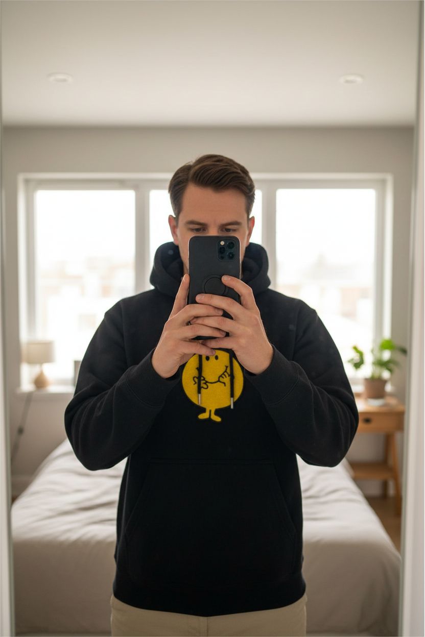 Pull à capuche Brodé Mr Happy 100% Cotton Sandro Paris Noir M debout, face à la caméra, dans une chambre à la lumière douce, avec une lumière naturelle filtrant par la fenêtre.