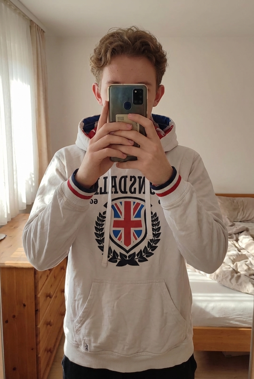 Pull à capuche lonsdale debout, face à la caméra, dans une chambre à la lumière douce, avec une lumière naturelle filtrant par la fenêtre.