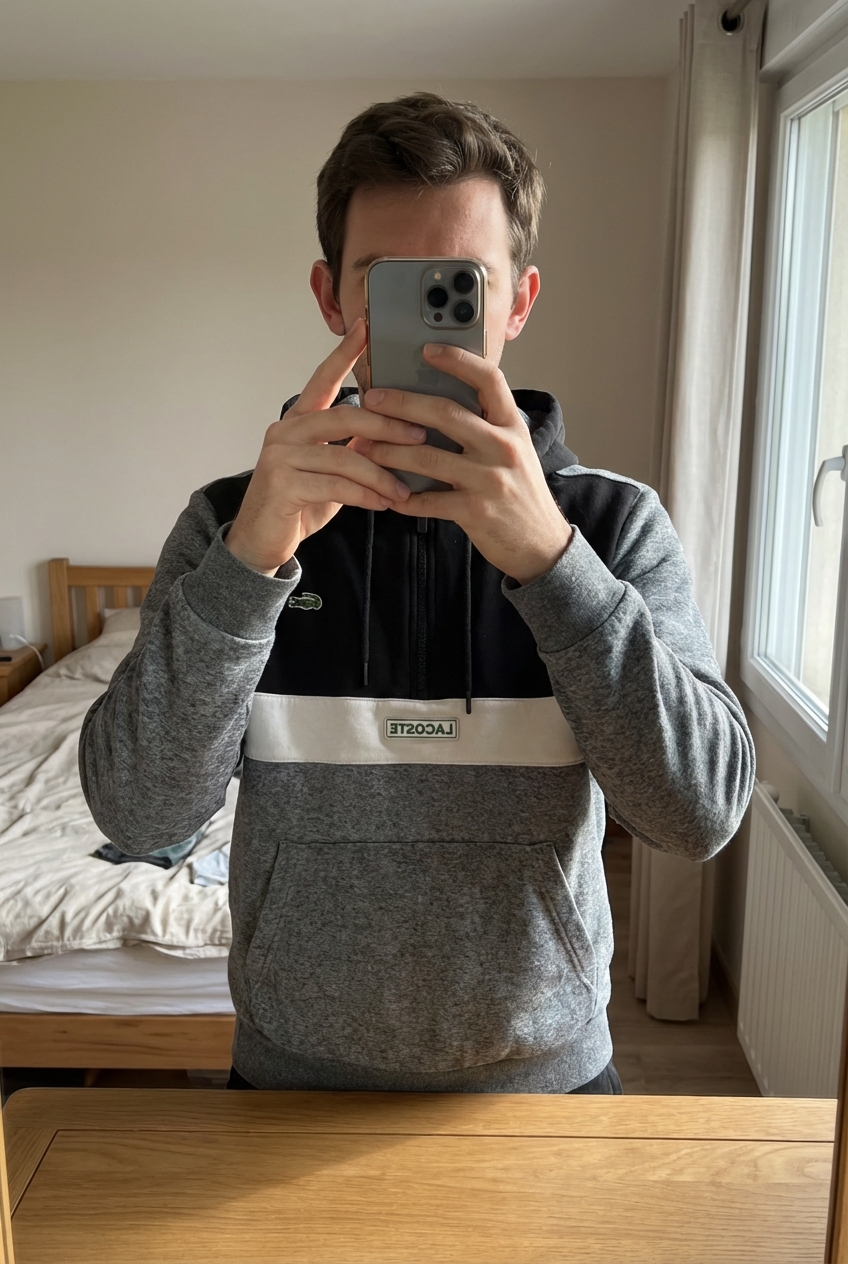 Pull à capuche QuarterZip Lacoste 100% Coton Gris S debout, face à la caméra, dans une chambre à la lumière douce, avec une lumière naturelle filtrant par la fenêtre.