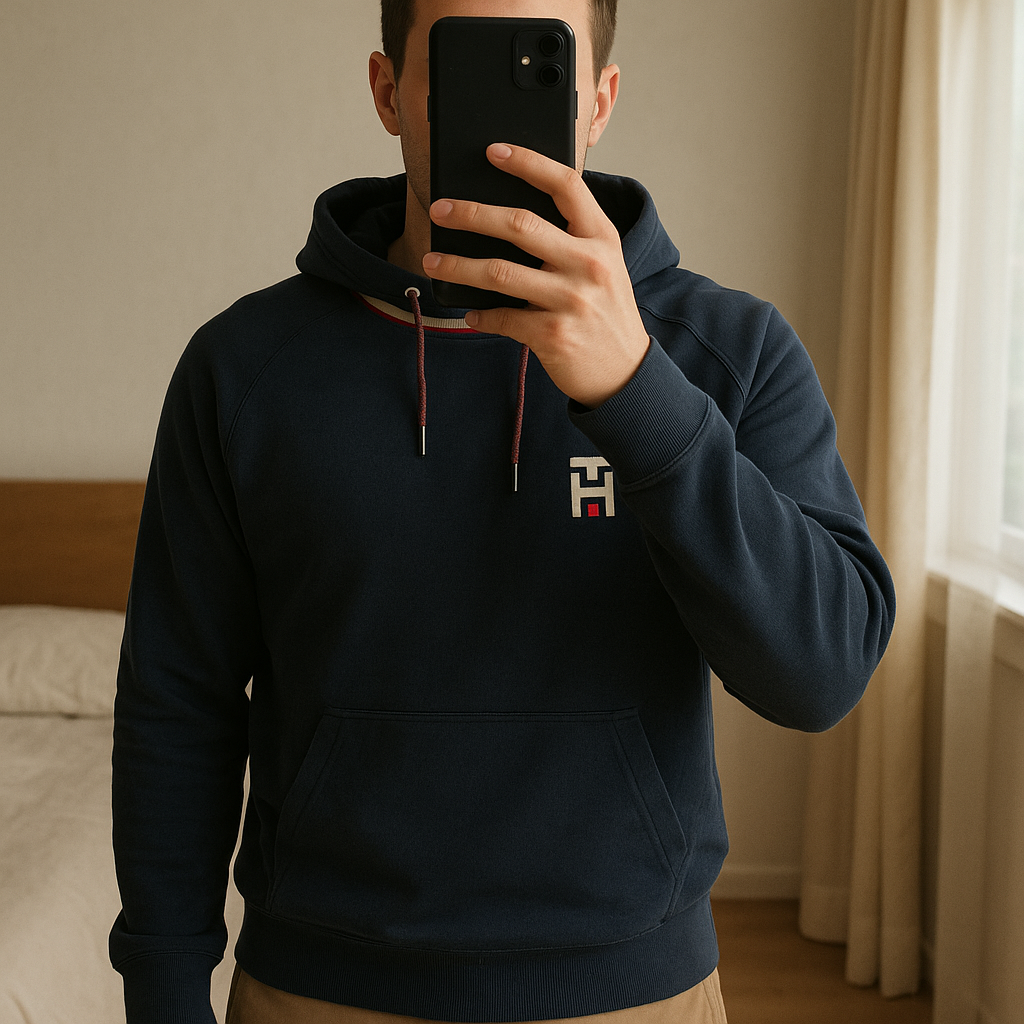 Pull à capuche Tommy Hilfiger – Homme – Marine – Taille XL debout, face à la caméra, dans une chambre à la lumière douce, avec une lumière naturelle filtrant par la fenêtre.