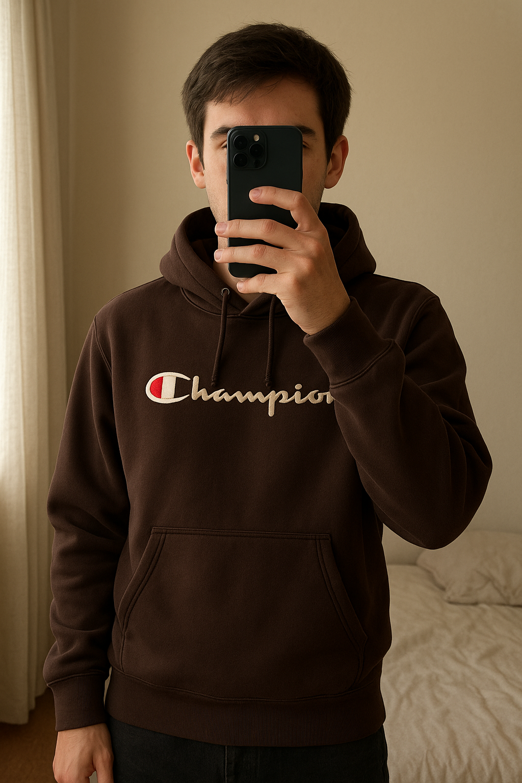 Pull champion debout, face à la caméra, dans une chambre à la lumière douce, avec une lumière naturelle filtrant par la fenêtre.