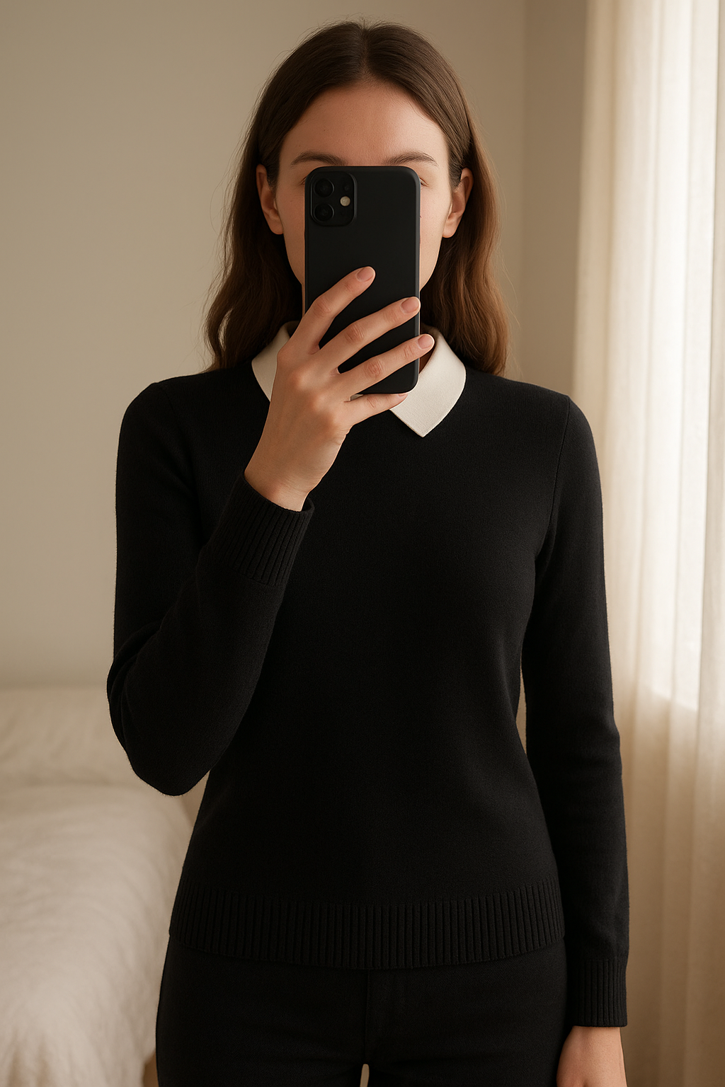 Pull col chemise Sud Express – Taille S debout, face à la caméra, dans une chambre à la lumière douce, avec une lumière naturelle filtrant par la fenêtre.