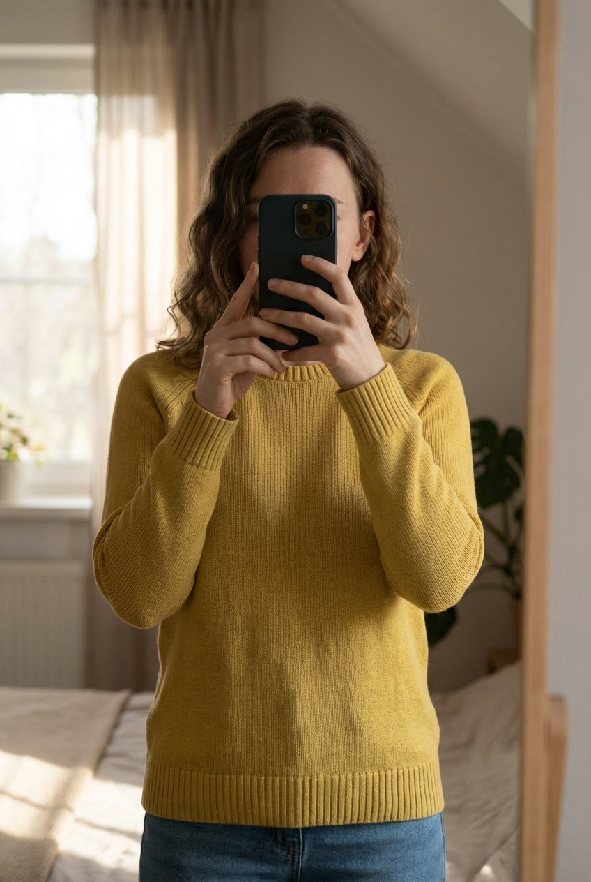 Pull Col Rond Vintage Y2K 100% Coton GAP Jaune L debout, face à la caméra, dans une chambre à la lumière douce, avec une lumière naturelle filtrant par la fenêtre.