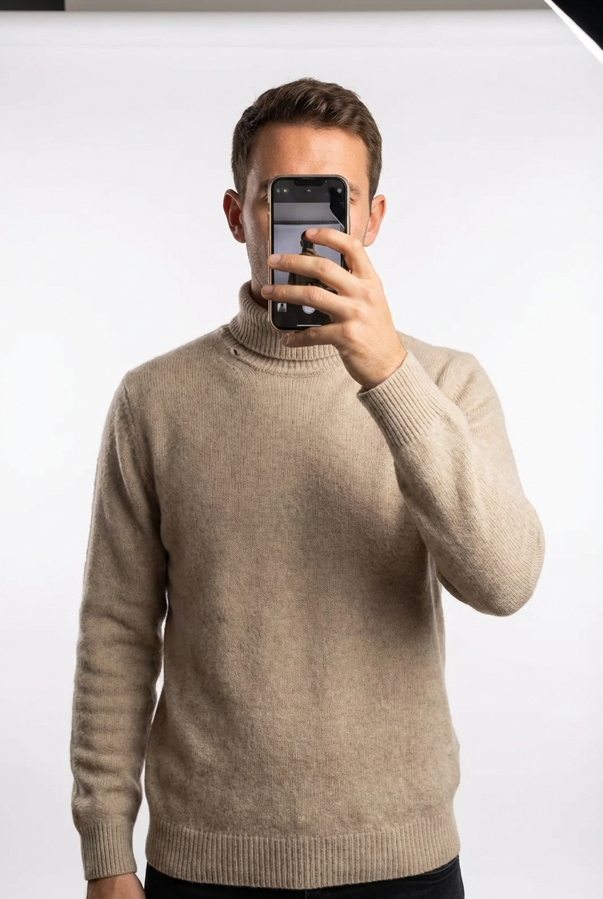 Une personne en Pull col roulé C&A 100% lambswool M beige camel - Doux & chaud ! debout, face à la caméra, dans un studio photo épuré avec fond blanc et éclairage doux.