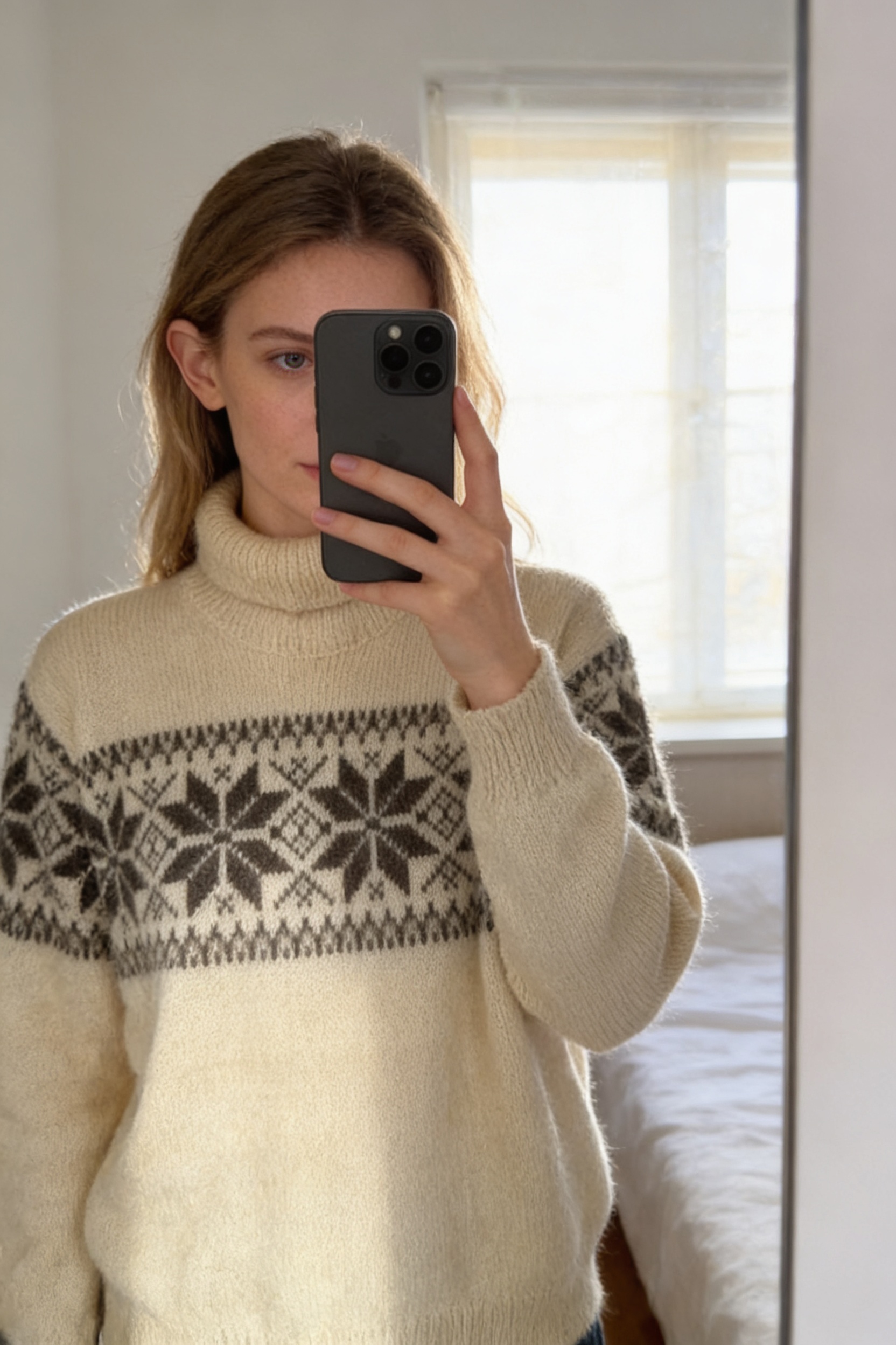 Une personne en Pull Col roulé Dale Of Norway Norvegian Made in Norway Handknit Fait Main Tricot 100% Laine Crème M debout, face à la caméra, dans une chambre à la lumière douce, avec une lumière naturelle filtrant par la fenêtre.