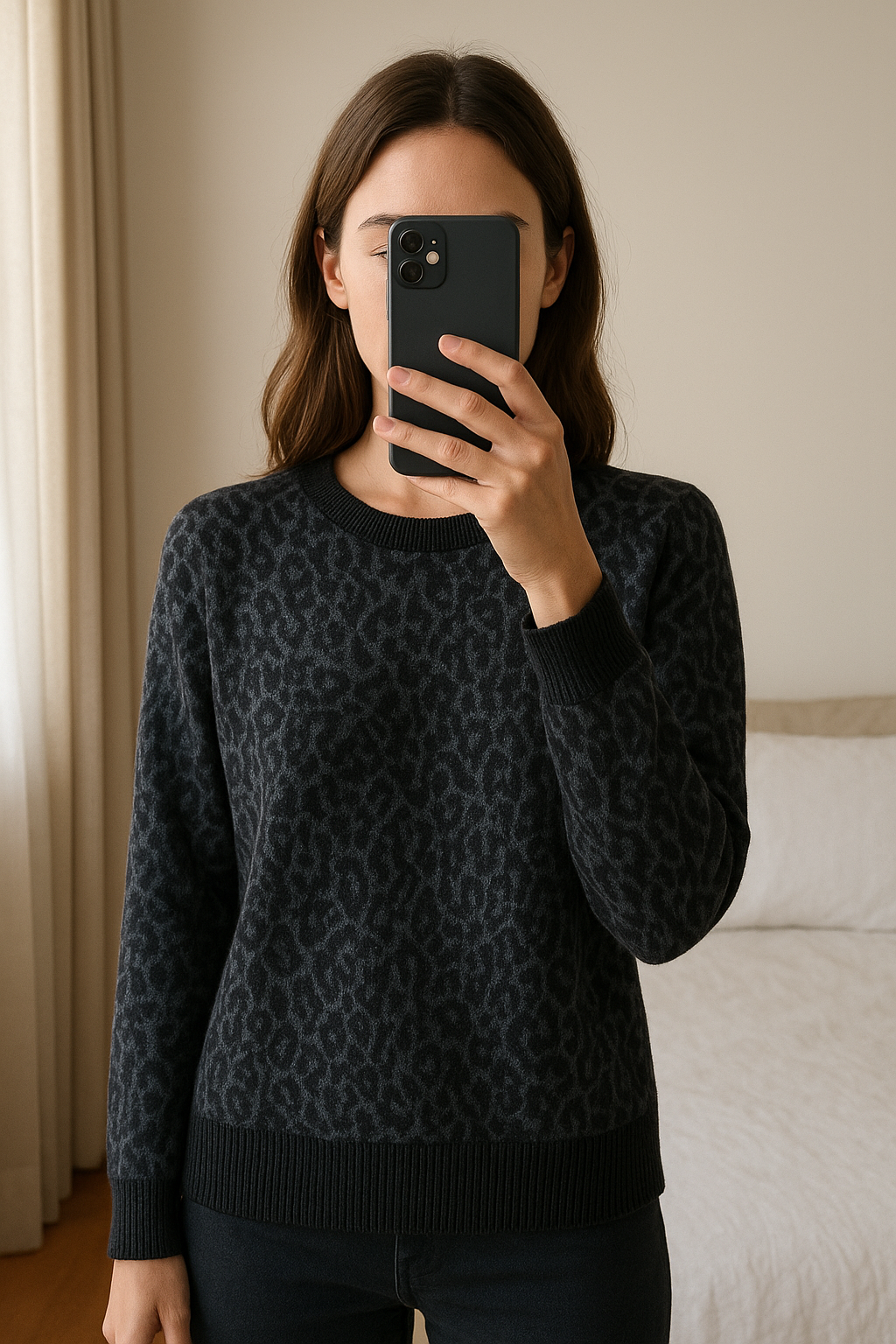 Pull Comptoir des Cotonniers – Taille M (taille grand), 30% laine / 3% cachemire debout, face à la caméra, dans une chambre à la lumière douce, avec une lumière naturelle filtrant par la fenêtre.