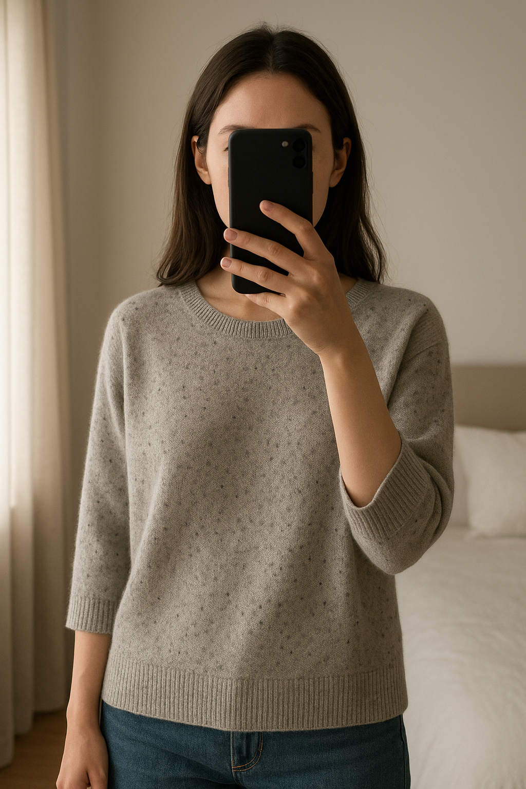 Pull en cashmere Tissaia 🧶 debout, face à la caméra, dans une chambre à la lumière douce, avec une lumière naturelle filtrant par la fenêtre.