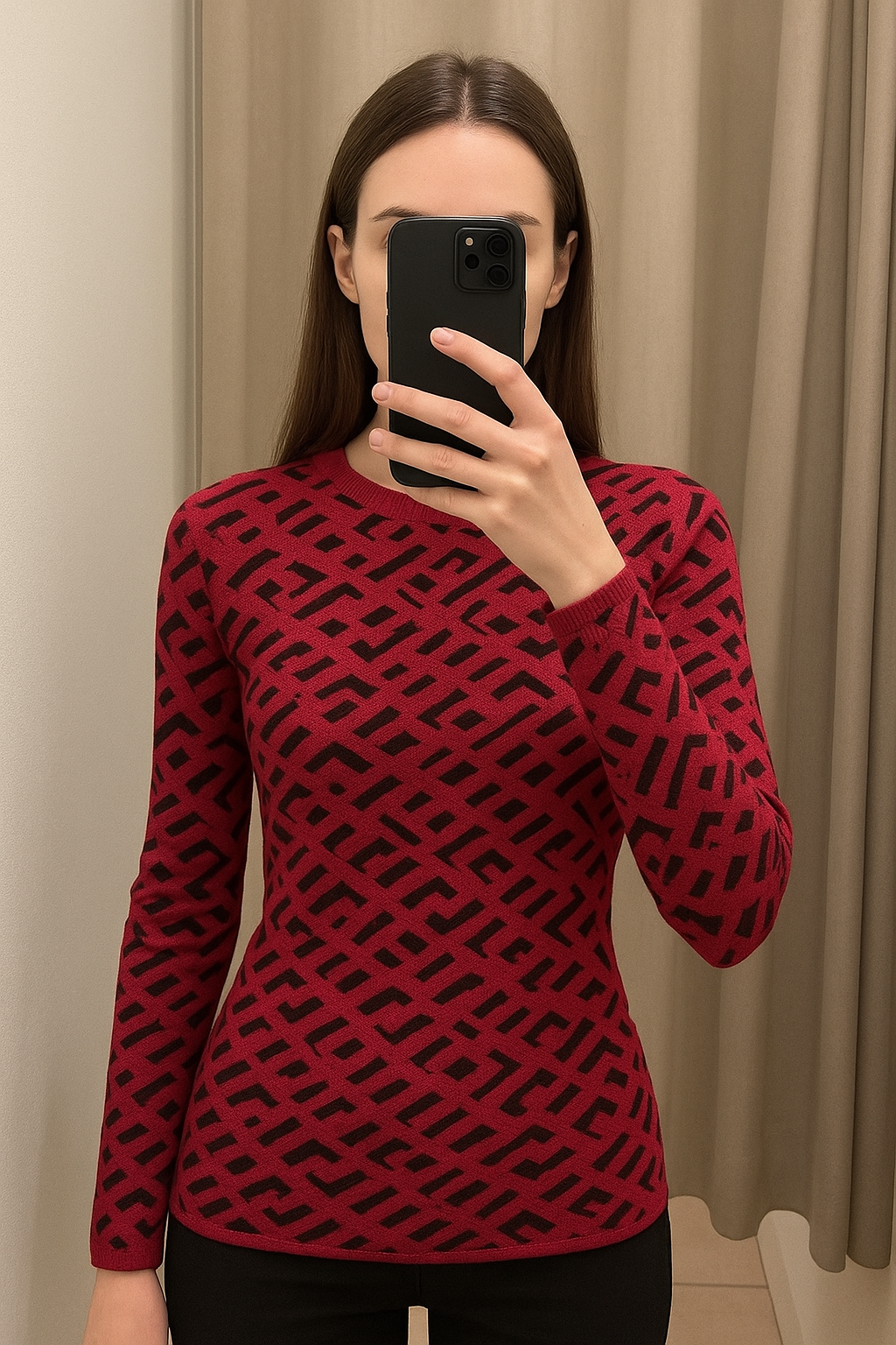 Une personne en Pull en soie Versace motif géométrique rouge et noir debout, face à la caméra, avec une silhouette fine, dans une cabine d’essayage de style boutique avec un miroir et une décoration neutre.