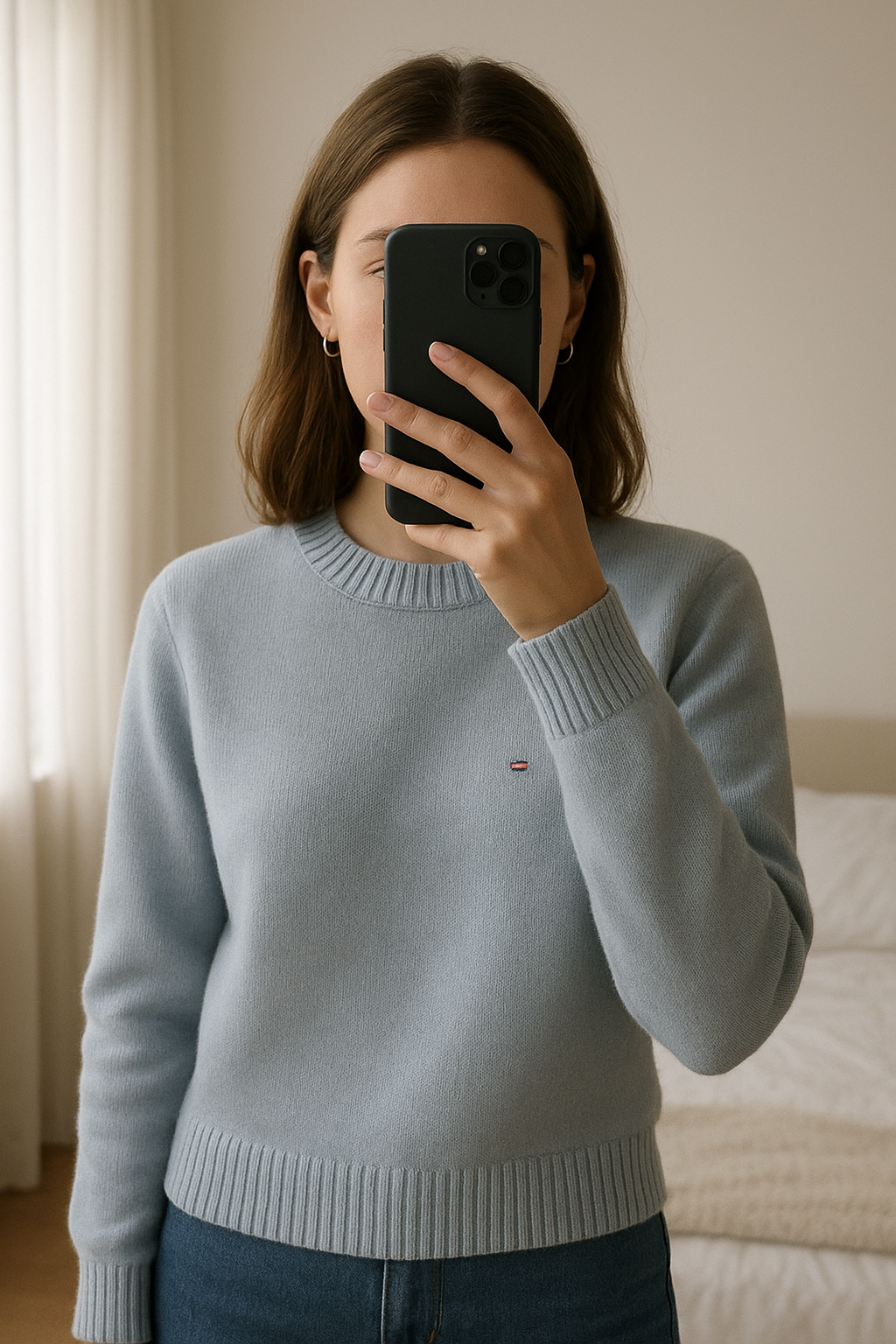 Pull epais cachemire et laine debout, face à la caméra, dans une chambre à la lumière douce, avec une lumière naturelle filtrant par la fenêtre.