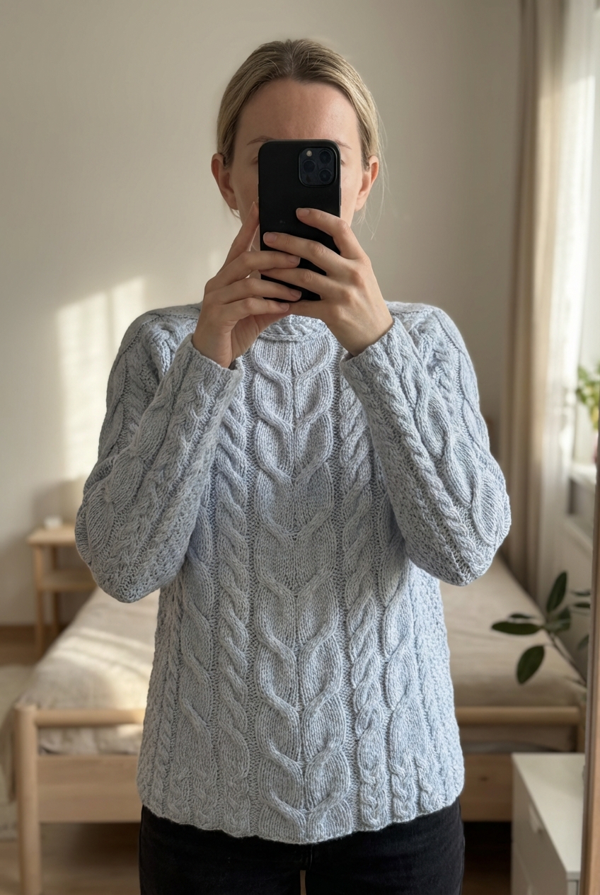Pull Fait Main Tricot Aran Wool Sweater 100% Laine Mérinos Bleu turquoise Aran Crafts XXL debout, face à la caméra, dans une chambre à la lumière douce, avec une lumière naturelle filtrant par la fenêtre.