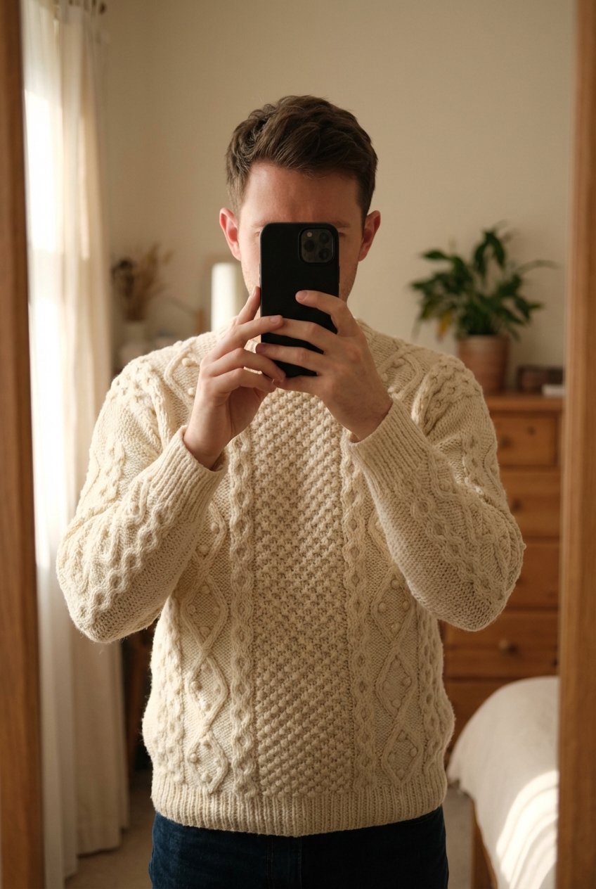 Pull Fait Main Tricot Aran Wool Sweater 100% Mix Laine Blanc Crème Aran Crafts L debout, face à la caméra, dans une chambre à la lumière douce, avec une lumière naturelle filtrant par la fenêtre.