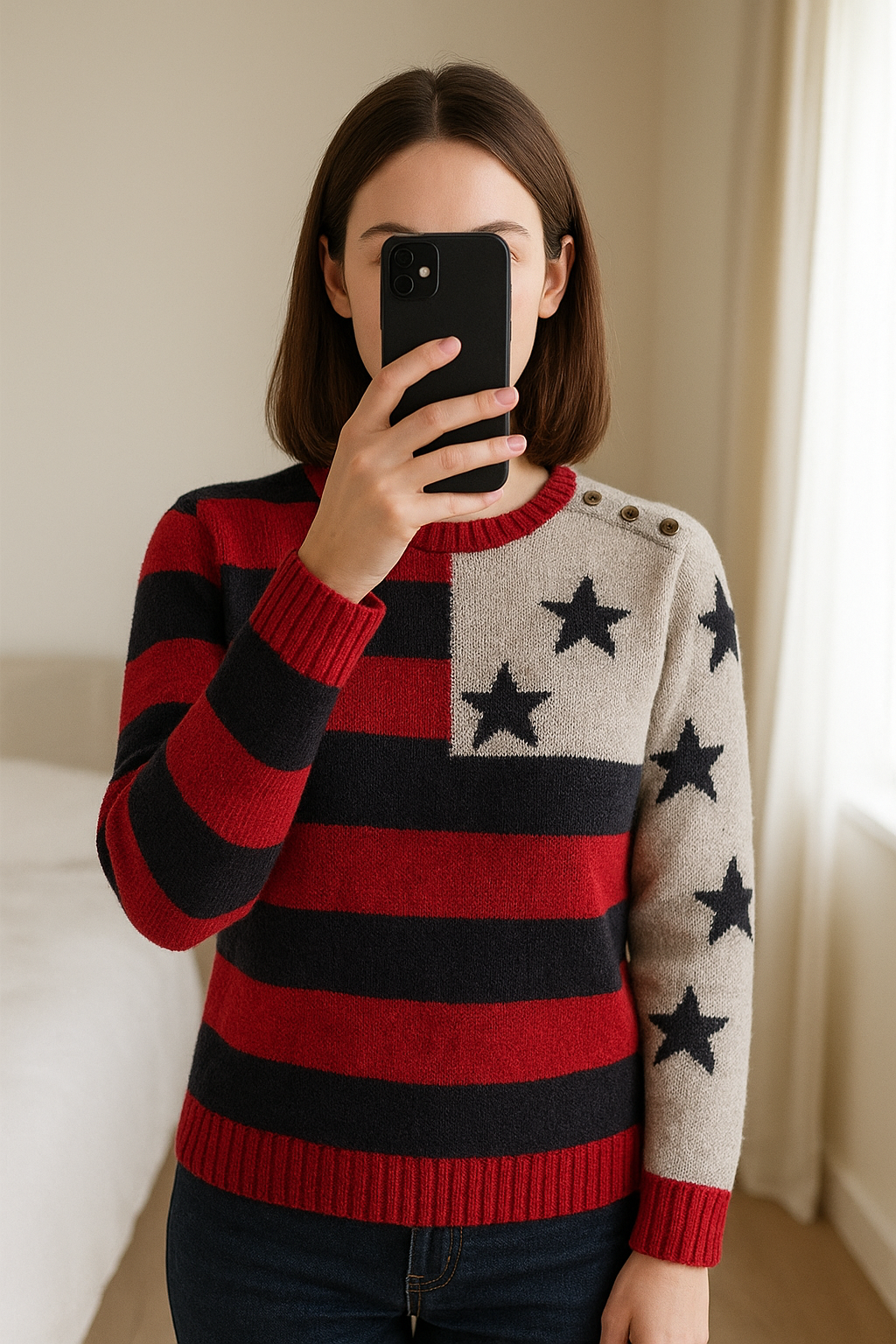Pull femme Tommy Hilfiger drapeau américain – Rouge, blanc et bleu – Taille L – SKU 50 debout, face à la caméra, dans une chambre à la lumière douce, avec une lumière naturelle filtrant par la fenêtre.