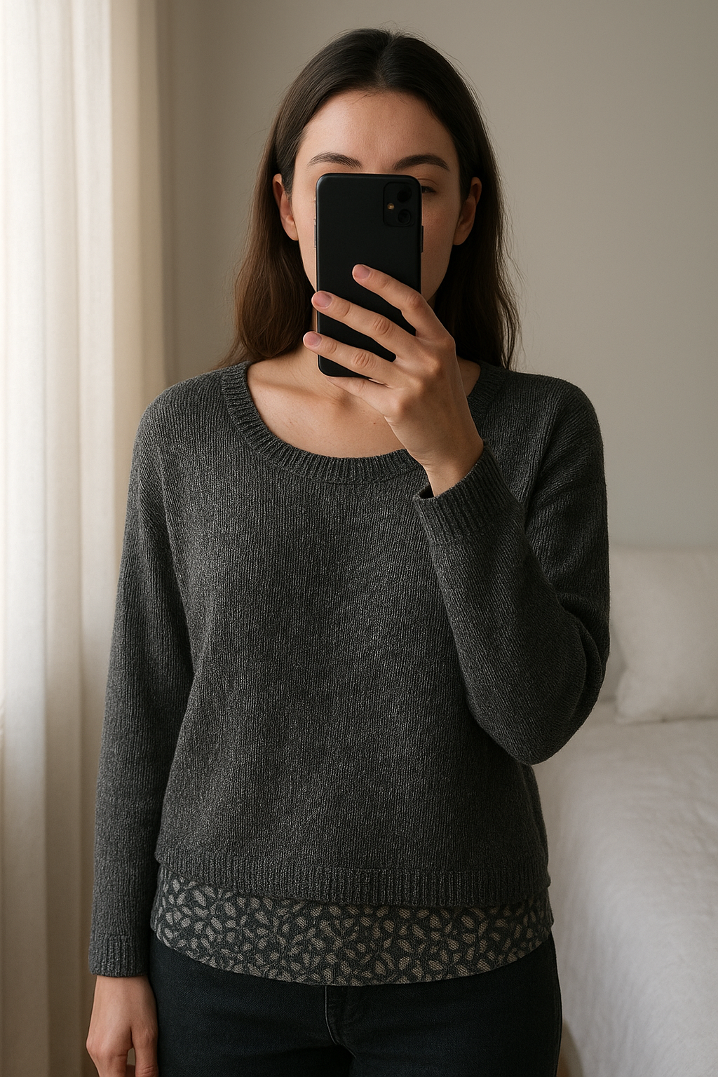Pull gris pailleté ouvert sur les épaules Taille S debout, face à la caméra, dans une chambre à la lumière douce, avec une lumière naturelle filtrant par la fenêtre.