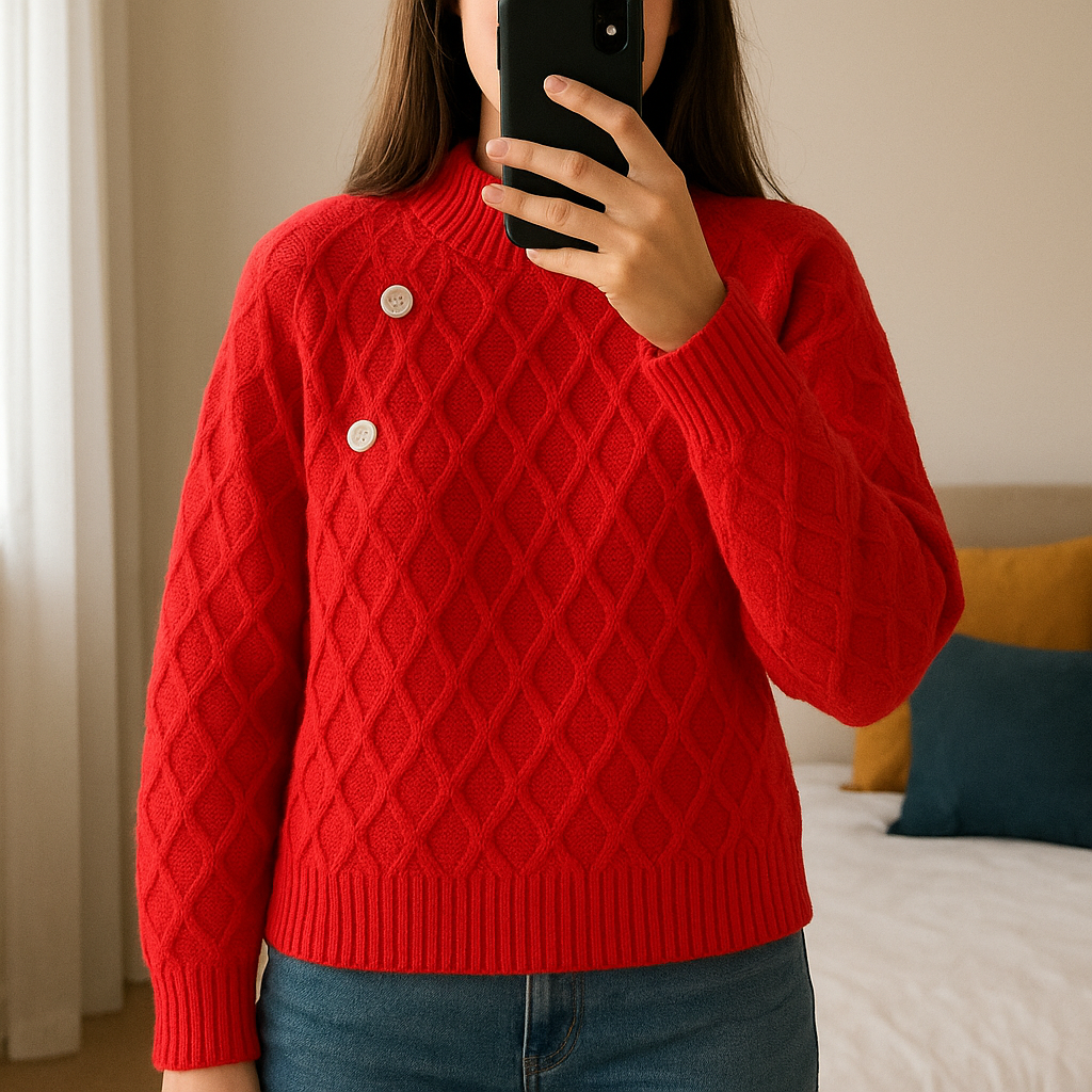 Pull grosse maille debout, face à la caméra, dans une chambre à la lumière douce, avec une lumière naturelle filtrant par la fenêtre.