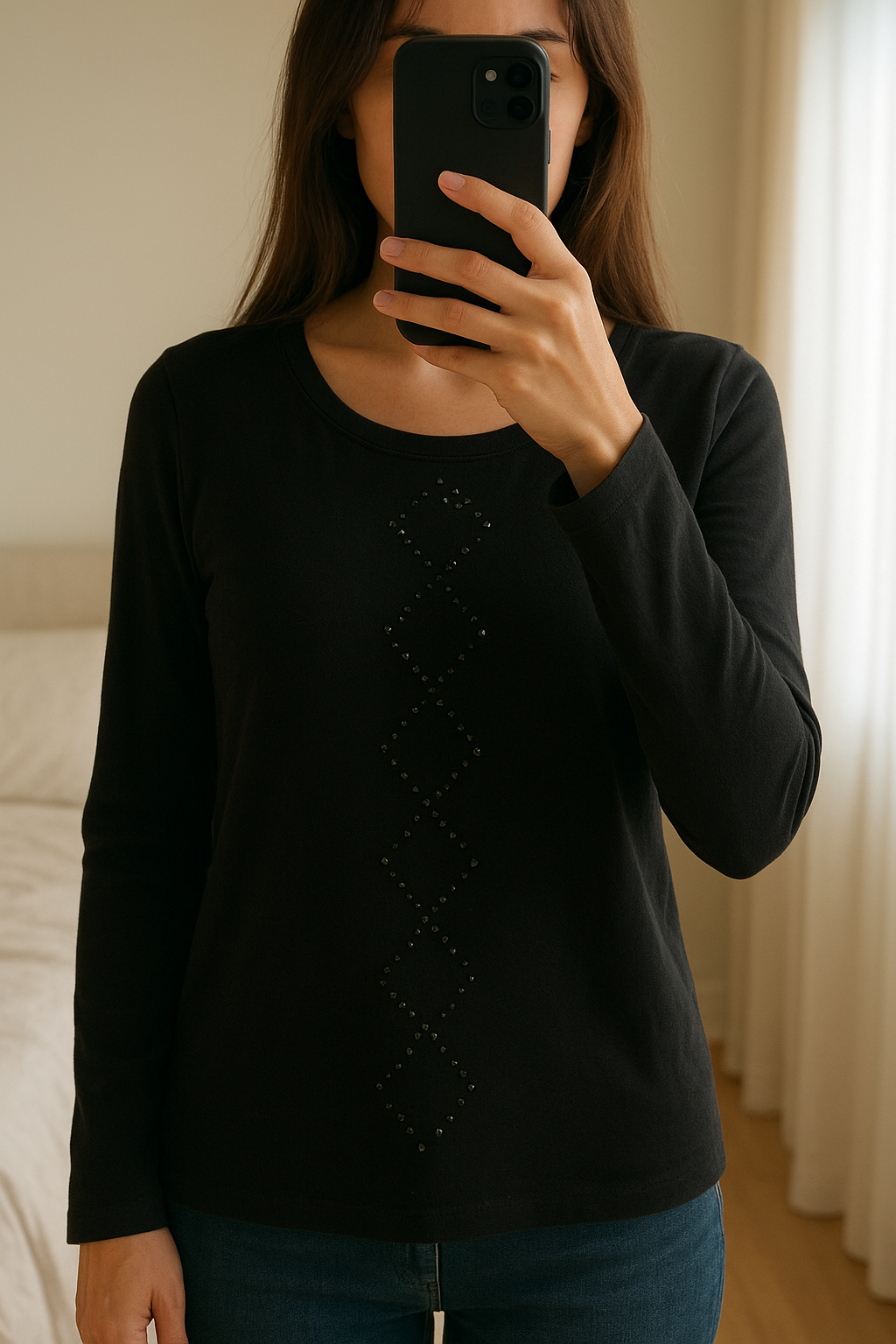 Pull hiver femme noir M - Maglione Donna M in piedi, rivolto verso la fotocamera, in una camera da letto con luce soffusa e luce naturale che filtra dalla finestra.