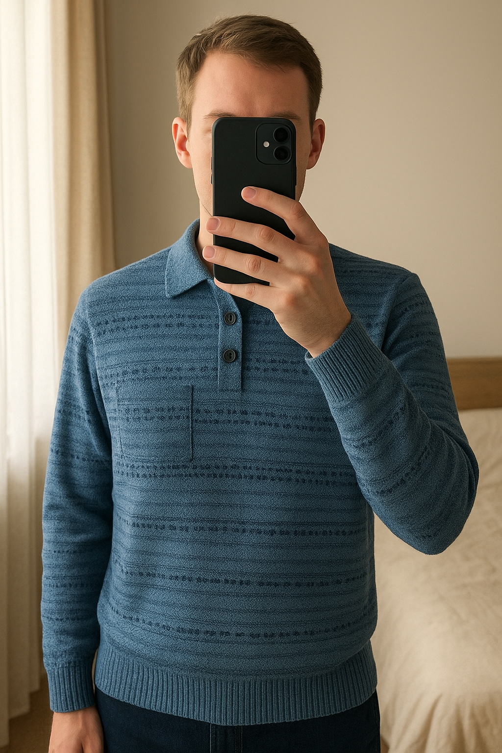 Pull homme laine - bleu/gris Damart taille L debout, face à la caméra, dans une chambre à la lumière douce, avec une lumière naturelle filtrant par la fenêtre.