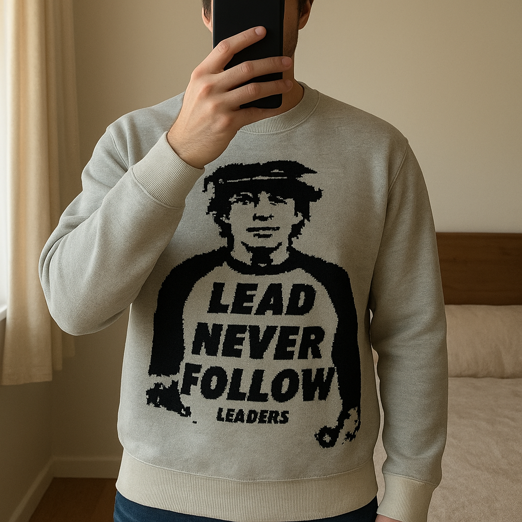 Pull knit graphic design debout, face à la caméra, dans une chambre à la lumière douce, avec une lumière naturelle filtrant par la fenêtre.