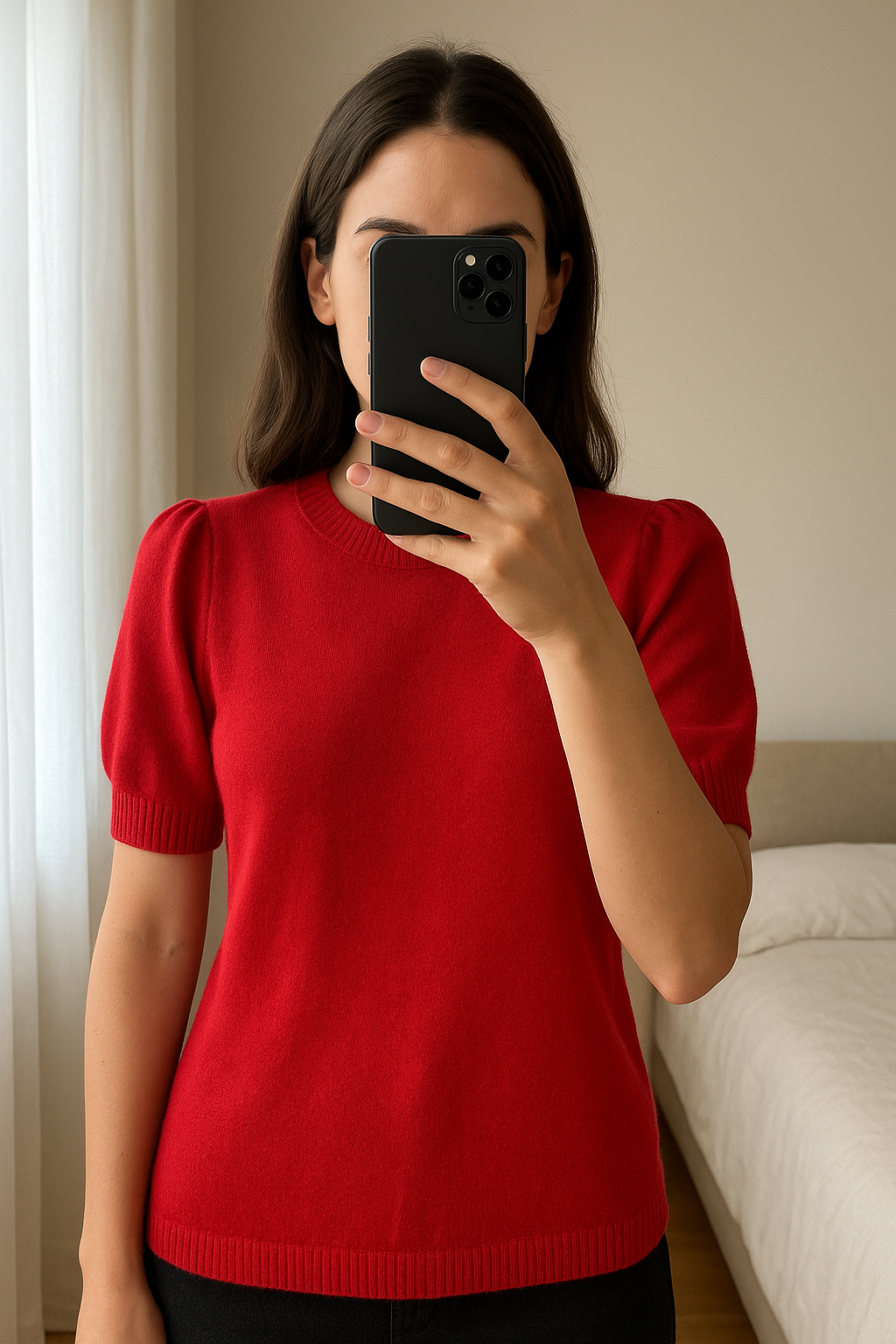 Pull laine manches courtes Naf Naf – Taille S – parfait pour les fêtes debout, face à la caméra, dans une chambre à la lumière douce, avec une lumière naturelle filtrant par la fenêtre.