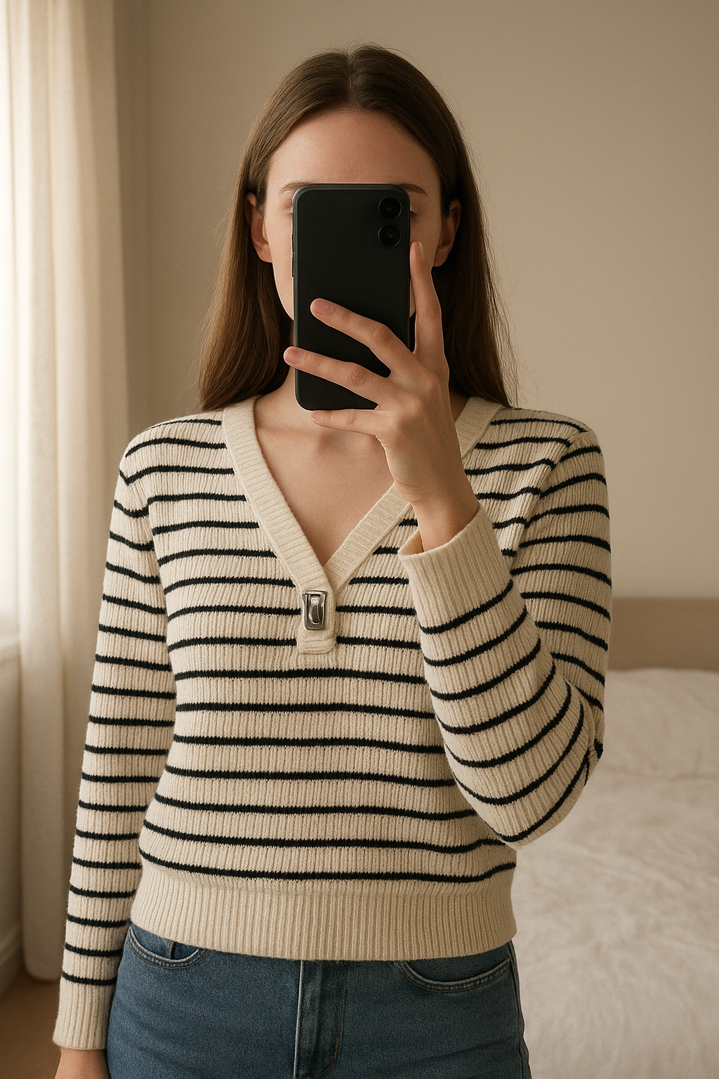 Pull Lauren Ralph Lauren debout, face à la caméra, dans une chambre à la lumière douce, avec une lumière naturelle filtrant par la fenêtre.