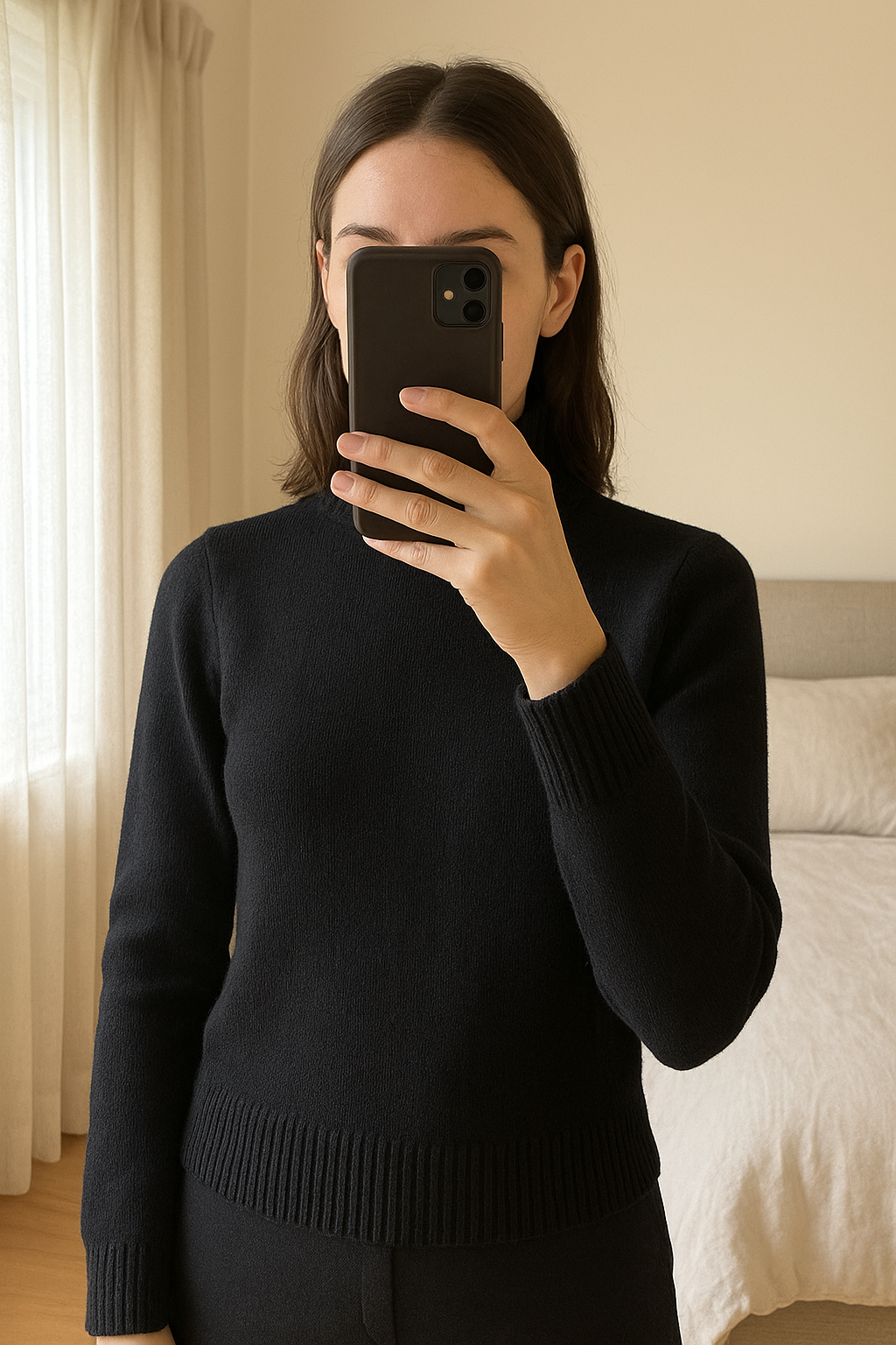 Pull Louis Vuitton Cachemire Noir Col Montant debout, face à la caméra, dans une chambre à la lumière douce, avec une lumière naturelle filtrant par la fenêtre.