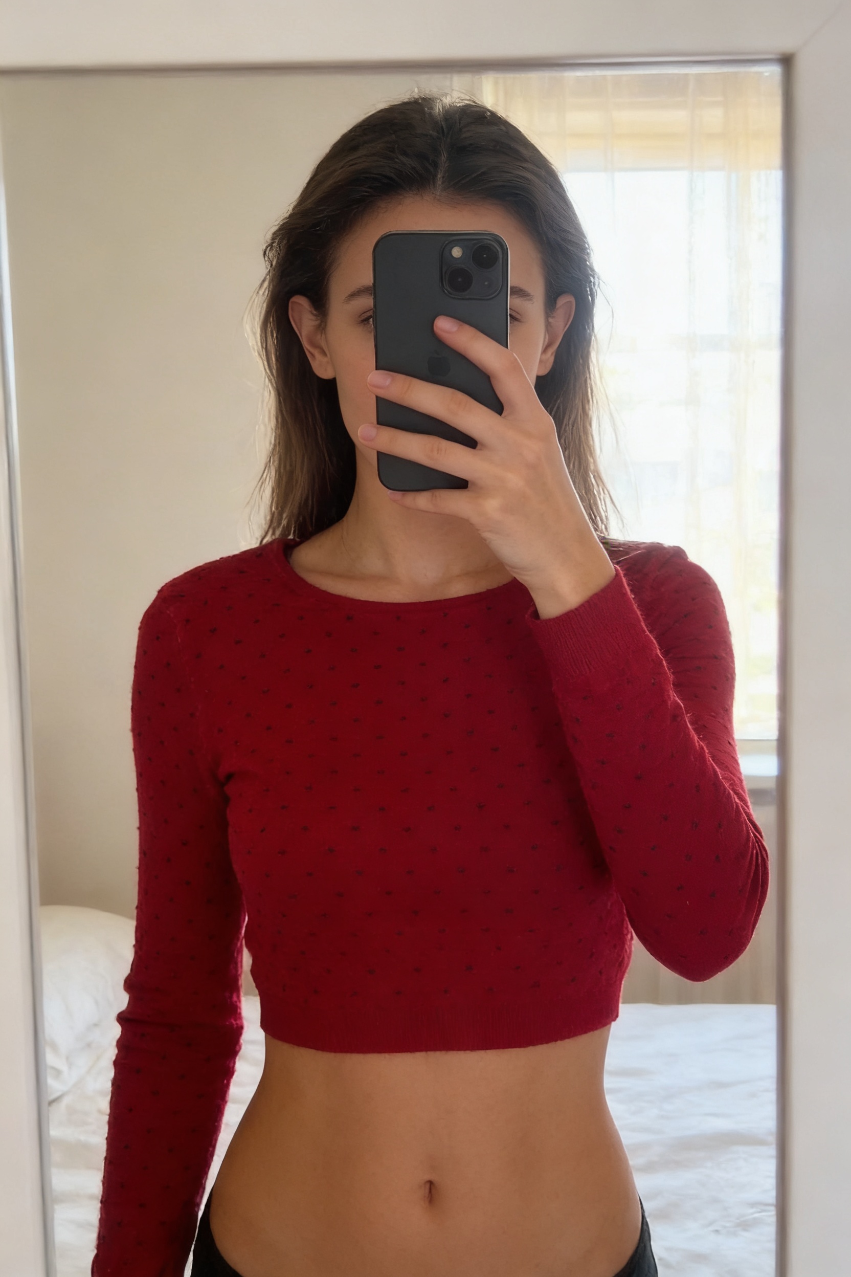 Une personne en Pull Mango – Taille S debout, face à la caméra, avec une silhouette fine, dans une chambre à la lumière douce, avec une lumière naturelle filtrant par la fenêtre.