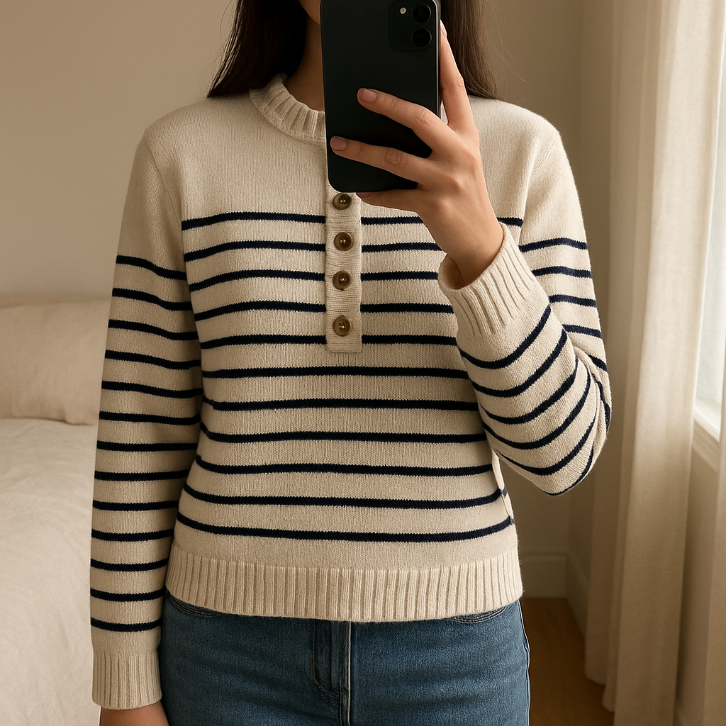 Pull Marinière Lili Lala debout, face à la caméra, dans une chambre à la lumière douce, avec une lumière naturelle filtrant par la fenêtre.