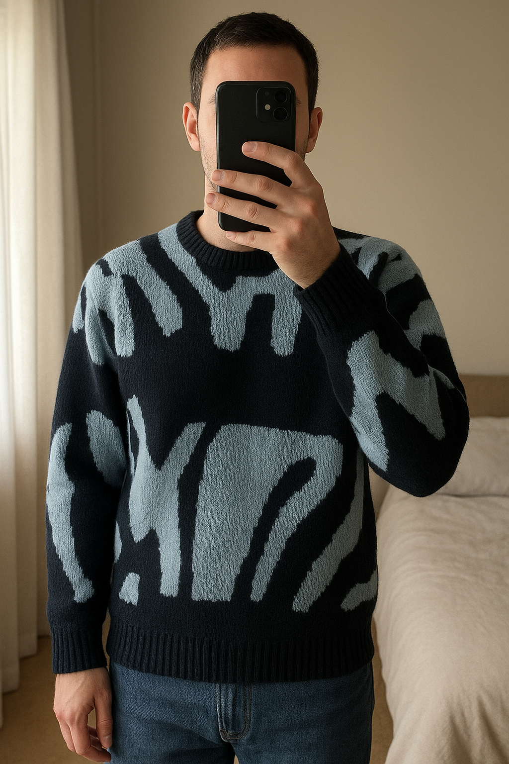 Pull à motif abstrait noir et gris debout, face à la caméra, dans une chambre à la lumière douce, avec une lumière naturelle filtrant par la fenêtre.