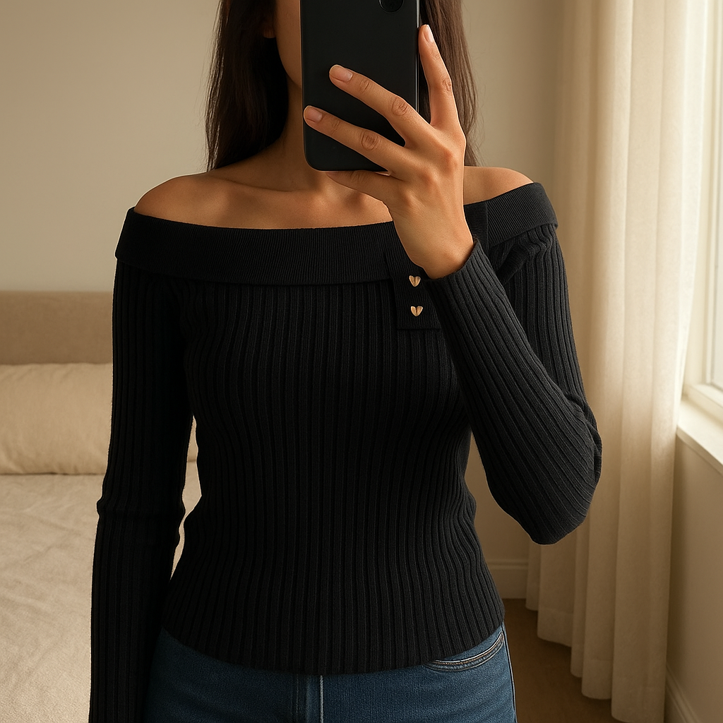 Une personne en Pull noir exquiss's debout, face à la caméra, avec une silhouette fine, dans une chambre à la lumière douce, avec une lumière naturelle filtrant par la fenêtre.