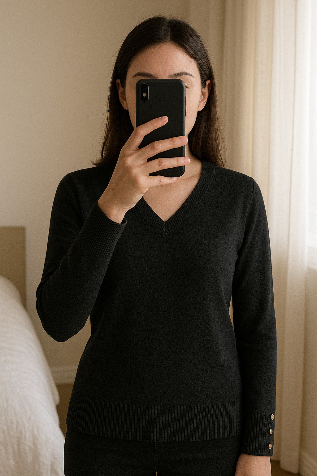 Pull noir Primark col V – Taille XS debout, face à la caméra, dans une chambre à la lumière douce, avec une lumière naturelle filtrant par la fenêtre.