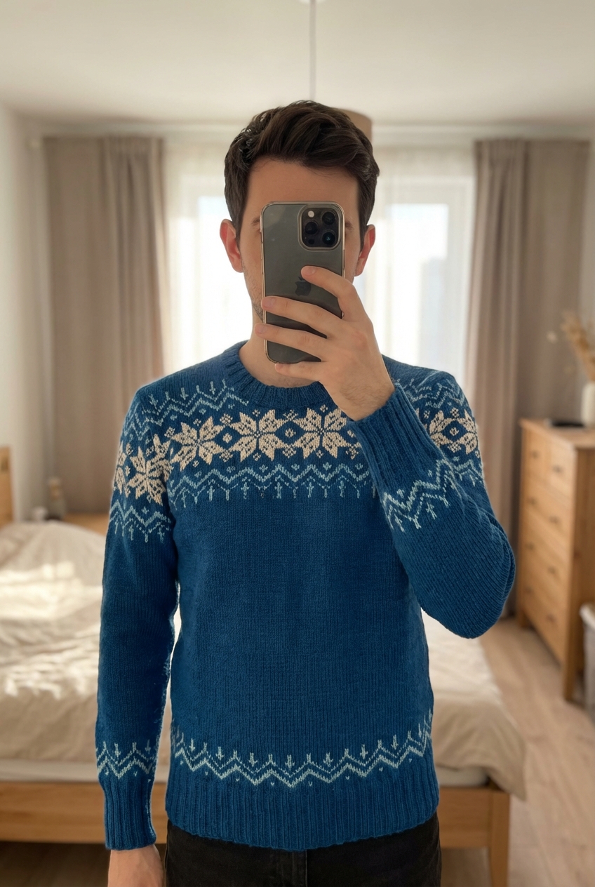 Pull Nordique Iceland Sweater Fait Main Tricot Mix Laine Acrylique Bleu S debout, face à la caméra, dans une chambre à la lumière douce, avec une lumière naturelle filtrant par la fenêtre.