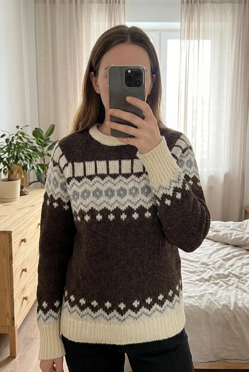 Pull Nordique Iceland Sweater Fait Main Tricot Mix Laine Acrylique marron L debout, face à la caméra, dans une chambre à la lumière douce, avec une lumière naturelle filtrant par la fenêtre.