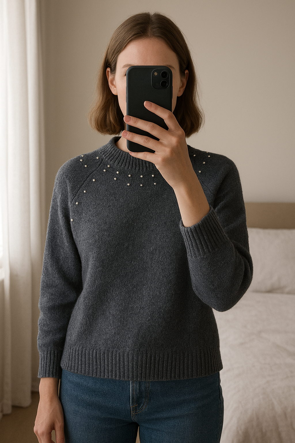 Pull à perles Jennyfer debout, face à la caméra, dans une chambre à la lumière douce, avec une lumière naturelle filtrant par la fenêtre.