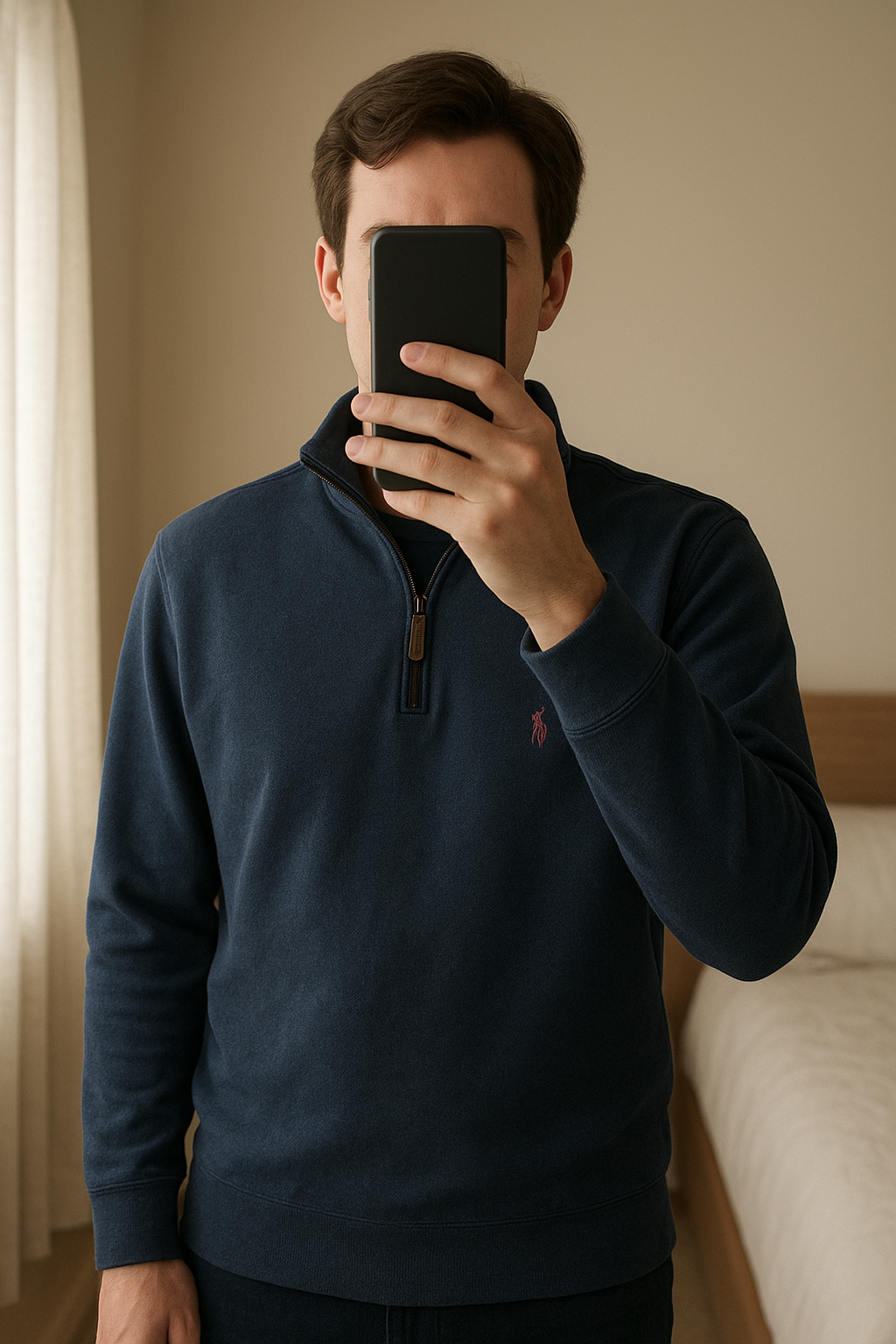 Pull Ralph Lauren bleu (XL TG) debout, face à la caméra, dans une chambre à la lumière douce, avec une lumière naturelle filtrant par la fenêtre.