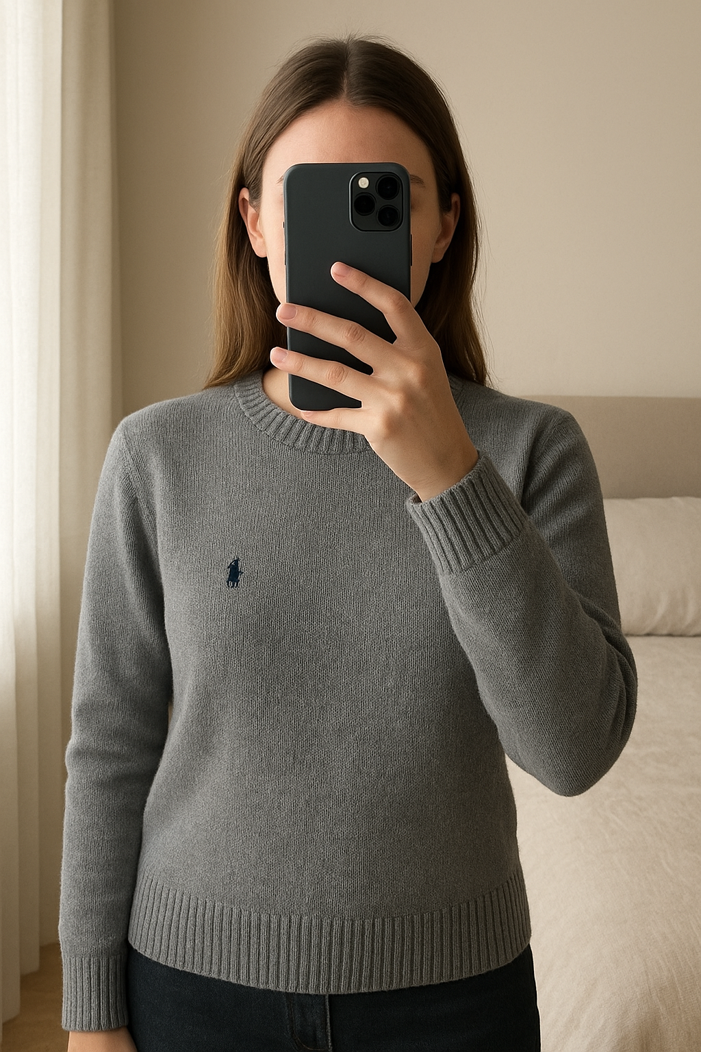 Pull Ralph Lauren pour femme talla [S] de pie, mirando a la cámara, en un dormitorio con luz suave y natural filtrándose por la ventana.