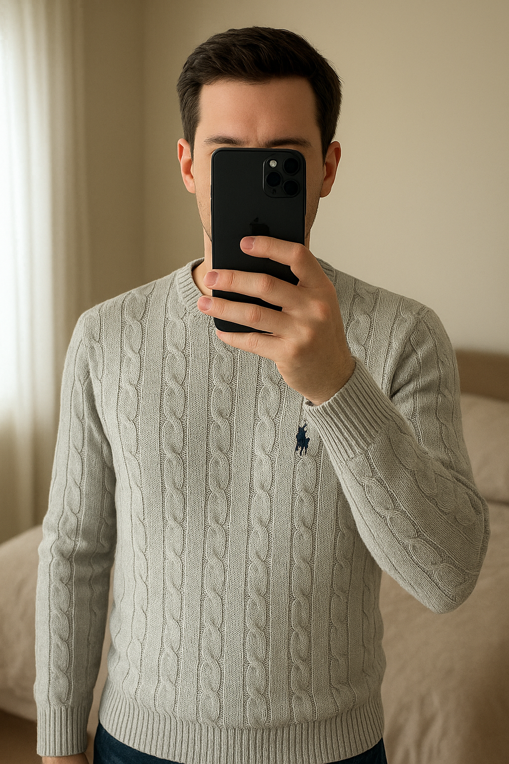 Pull Ralph Lauren Talla [M] d’authenticité de pie, mirando a la cámara, en un dormitorio con luz suave y natural filtrándose por la ventana.