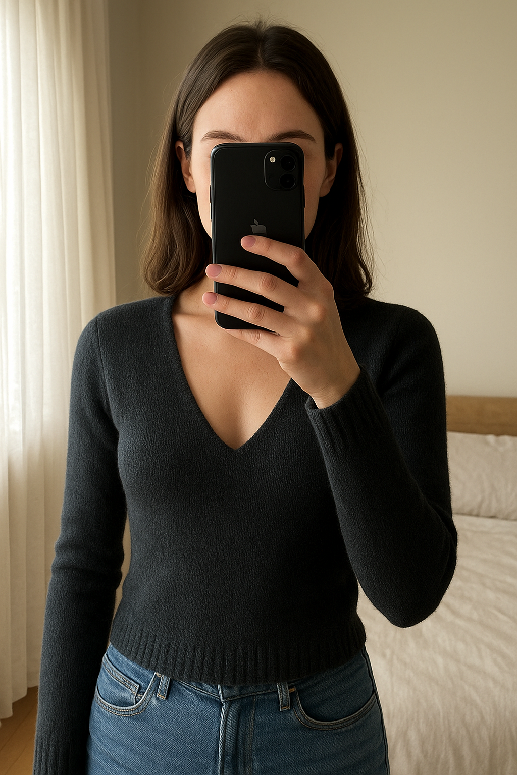 Pull Éric Bompard Col V Cropped Noir 100% Cachemire debout, face à la caméra, dans une chambre à la lumière douce, avec une lumière naturelle filtrant par la fenêtre.
