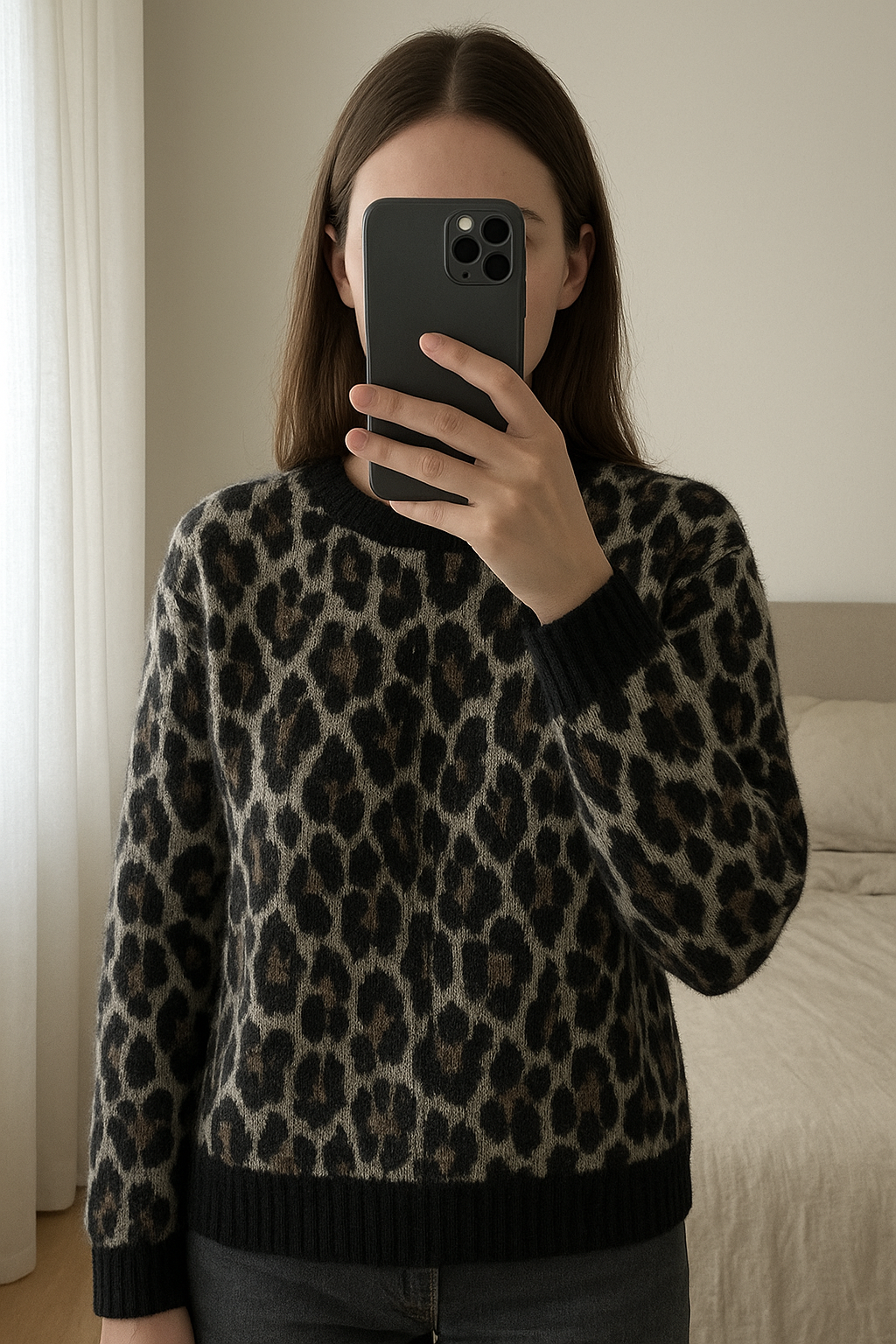 Pull Saint Laurent léopard en laine debout, face à la caméra, dans une chambre à la lumière douce, avec une lumière naturelle filtrant par la fenêtre.