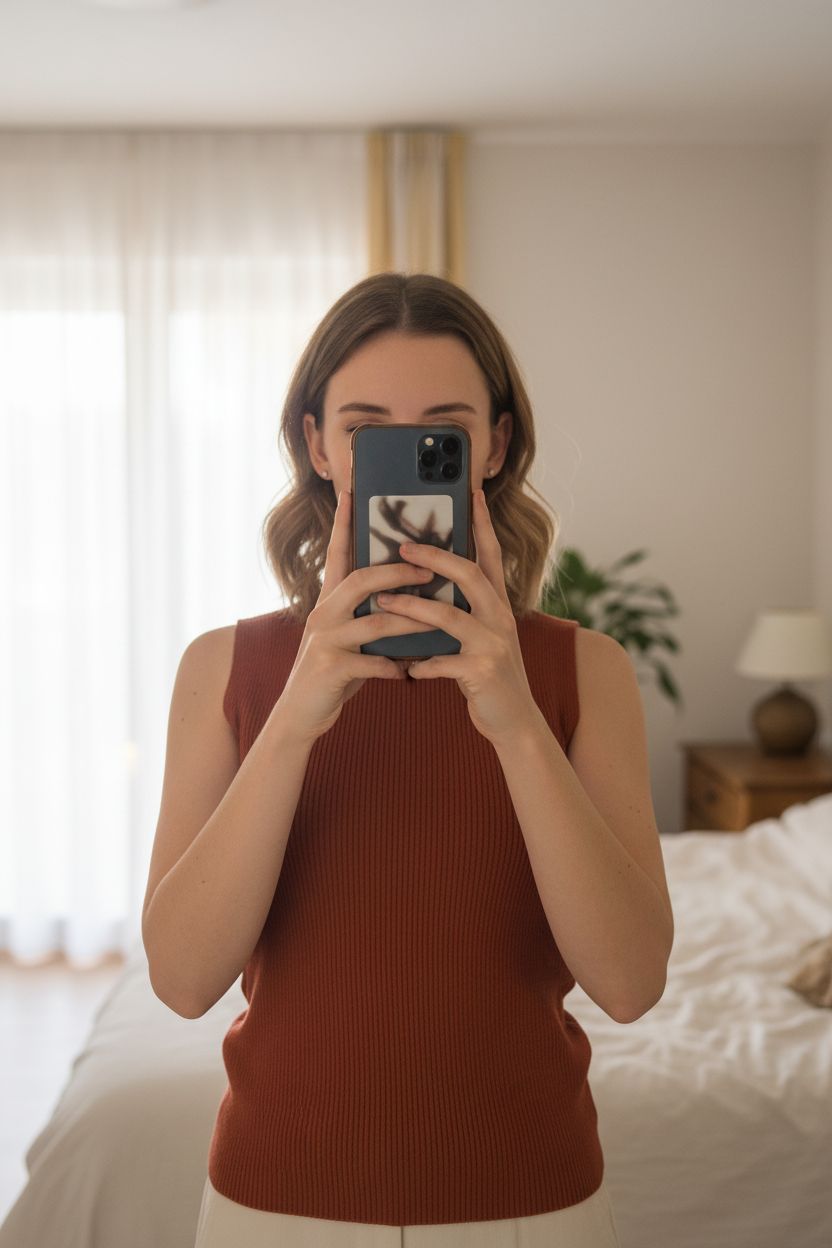 Pull sans manche col roulé orange debout, face à la caméra, dans une chambre à la lumière douce, avec une lumière naturelle filtrant par la fenêtre.