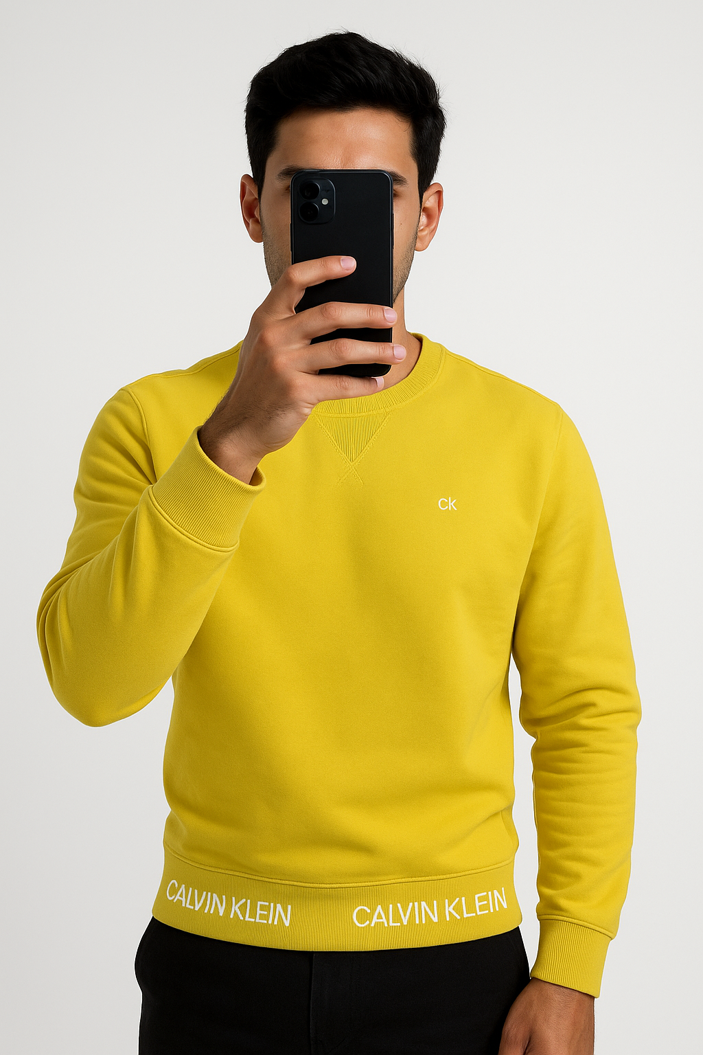 Une personne en Pull / Sweat Calvin Klein - Jaune - Taille XL cambrant légèrement le dos pour une pose dynamique, dans un studio photo épuré avec fond blanc et éclairage doux.