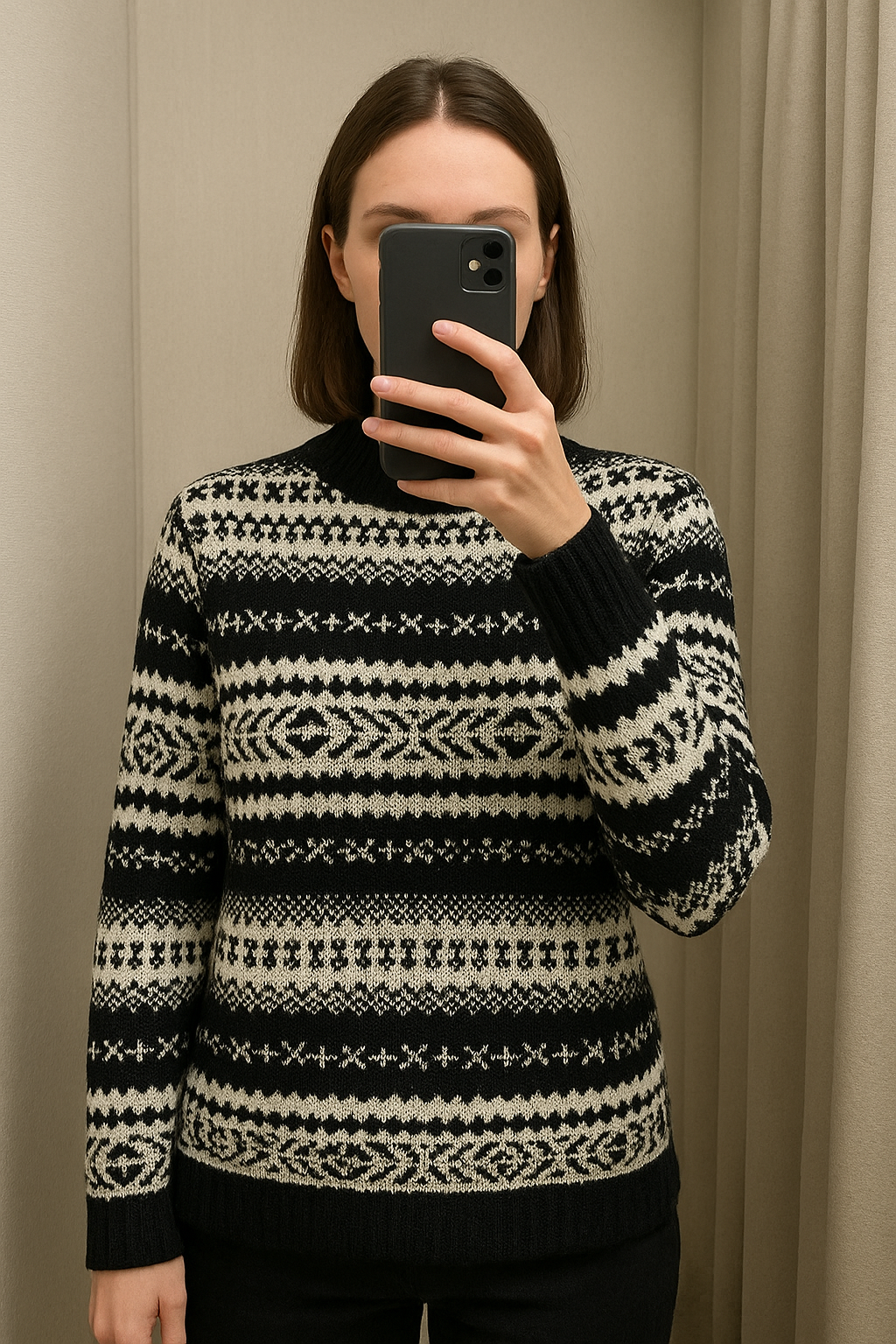 Une personne en pull sweat col roulé Yves saint Laurent 100% cachemire debout, face à la caméra, avec une silhouette fine, dans une cabine d’essayage de style boutique avec un miroir et une décoration neutre.