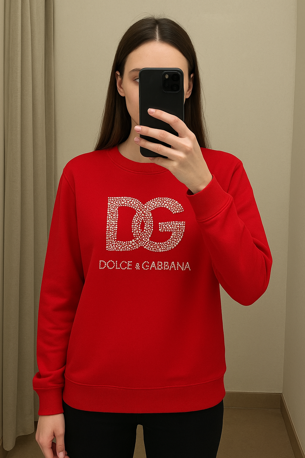 Une personne en Pull sweat femme dolce gabbana rouge avec strass debout, face à la caméra, avec une silhouette fine, dans une cabine d’essayage de style boutique avec un miroir et une décoration neutre.