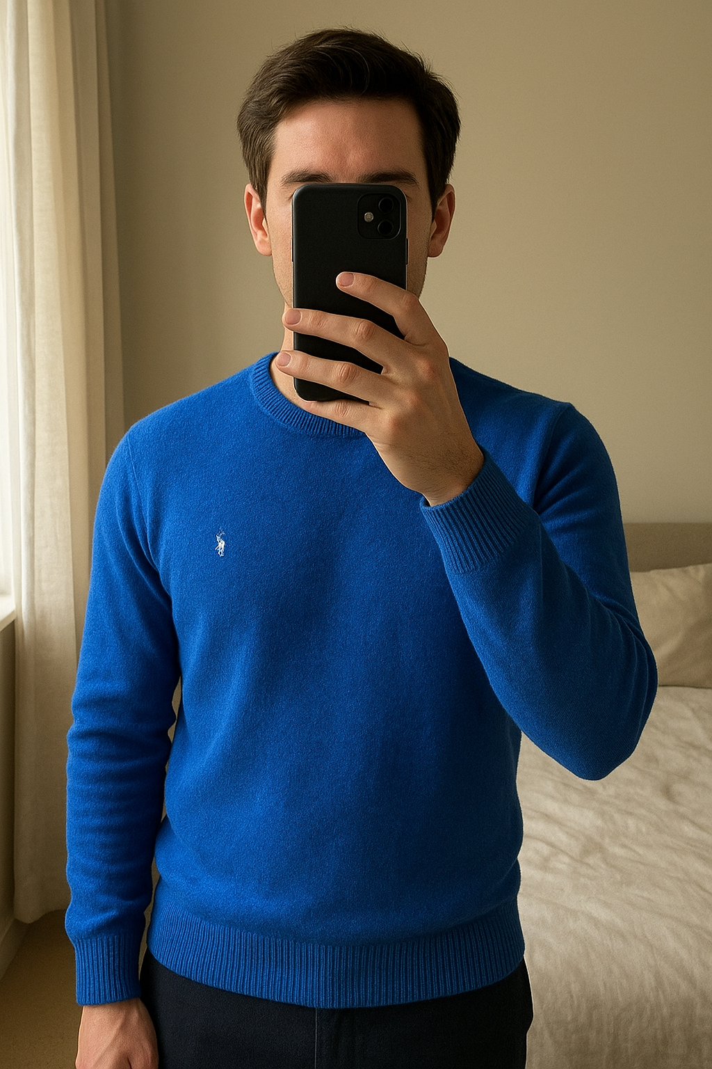 Pull/sweat Ralph Lauren bleu et blanc debout, face à la caméra, dans une chambre à la lumière douce, avec une lumière naturelle filtrant par la fenêtre.