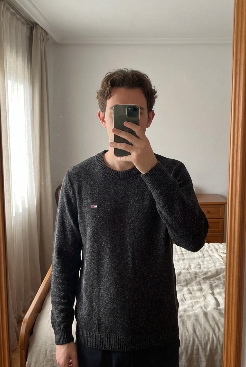 Une personne en Pull Tommy debout, face à la caméra, dans une chambre à la lumière douce, avec une lumière naturelle filtrant par la fenêtre.