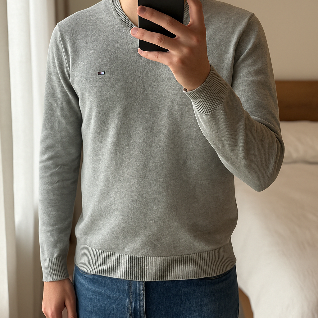 Pull Tommy Hilfiger – Gris – Taille M debout, face à la caméra, dans une chambre à la lumière douce, avec une lumière naturelle filtrant par la fenêtre.