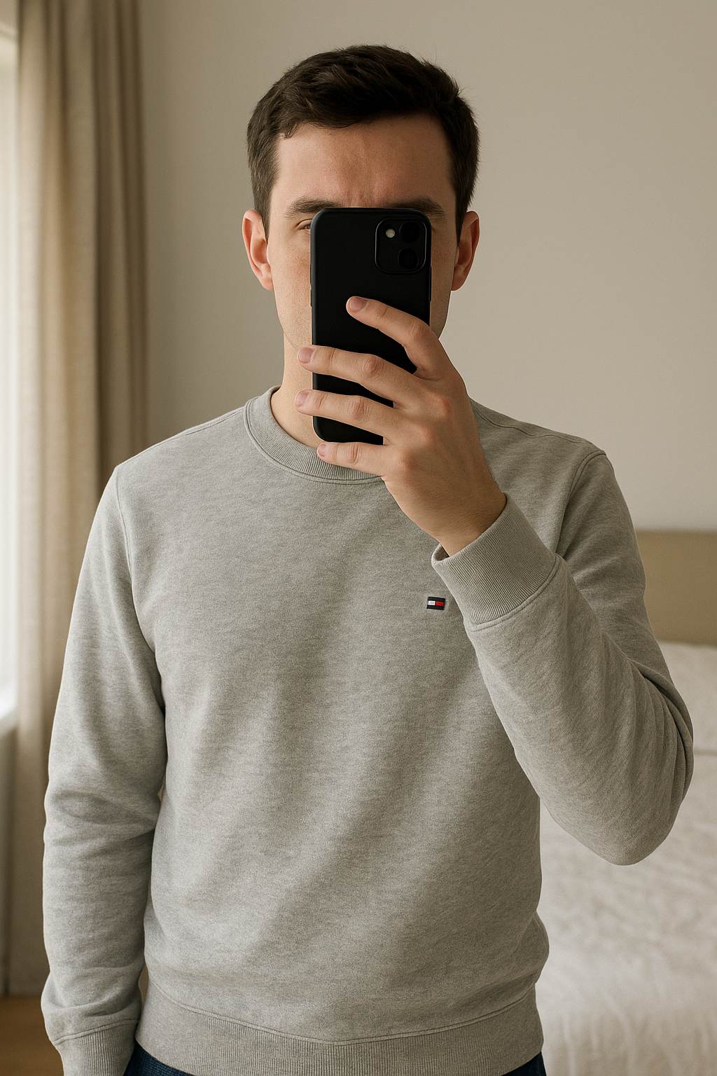 pull tommy hilfiger gris taille XL debout, face à la caméra, dans une chambre à la lumière douce, avec une lumière naturelle filtrant par la fenêtre.